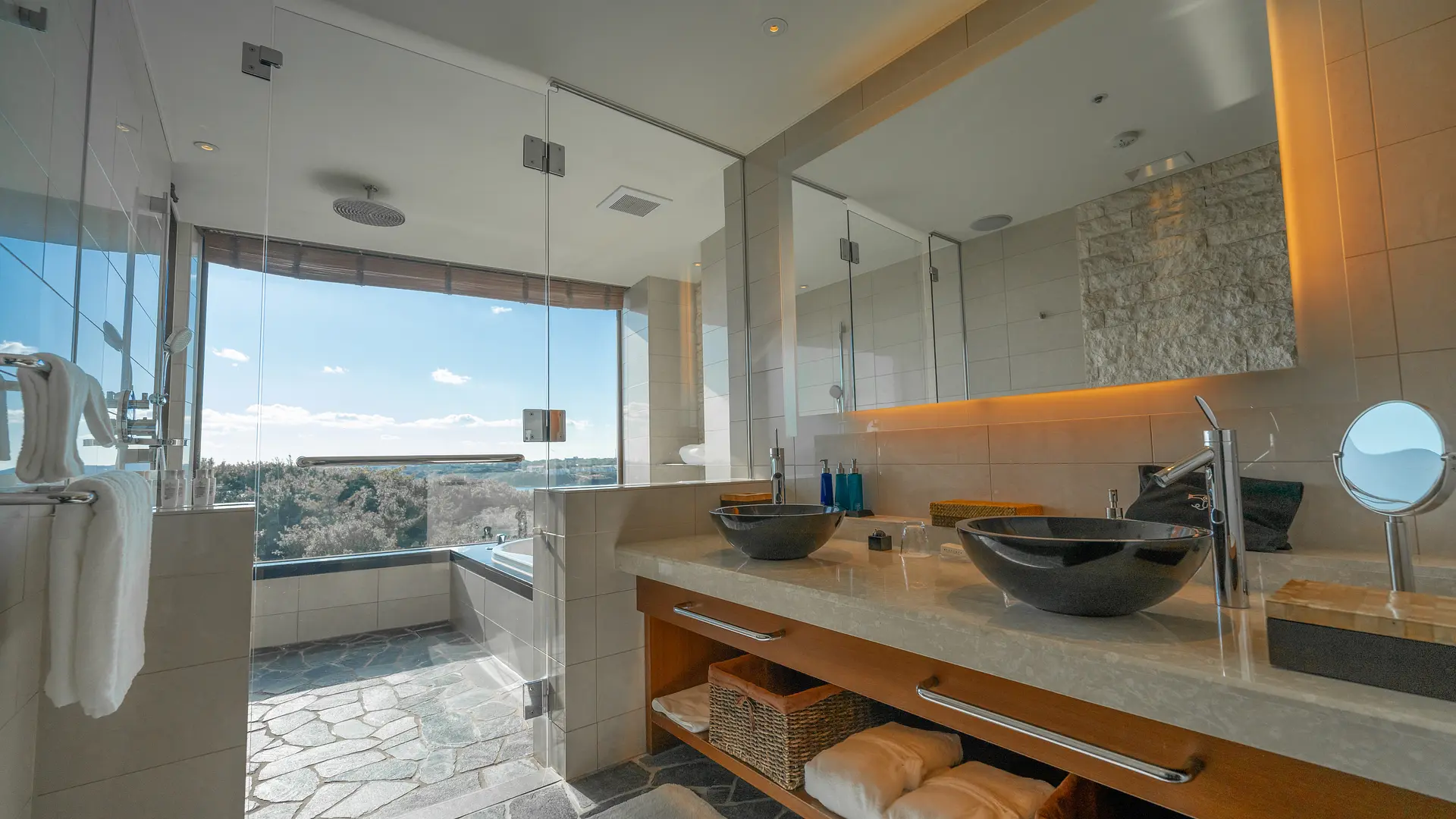 「ザ ベイスイート」の客室は、リビング、ベッドルーム、バスルームがそれぞれ部屋として分かれているため、「邸宅のようにくつろげる」のも魅力のひとつ。リビングやバスルームの窓からは、伊勢志摩国立公園の象徴ともいえる英虞湾や雄大な自然を楽しむことができます。