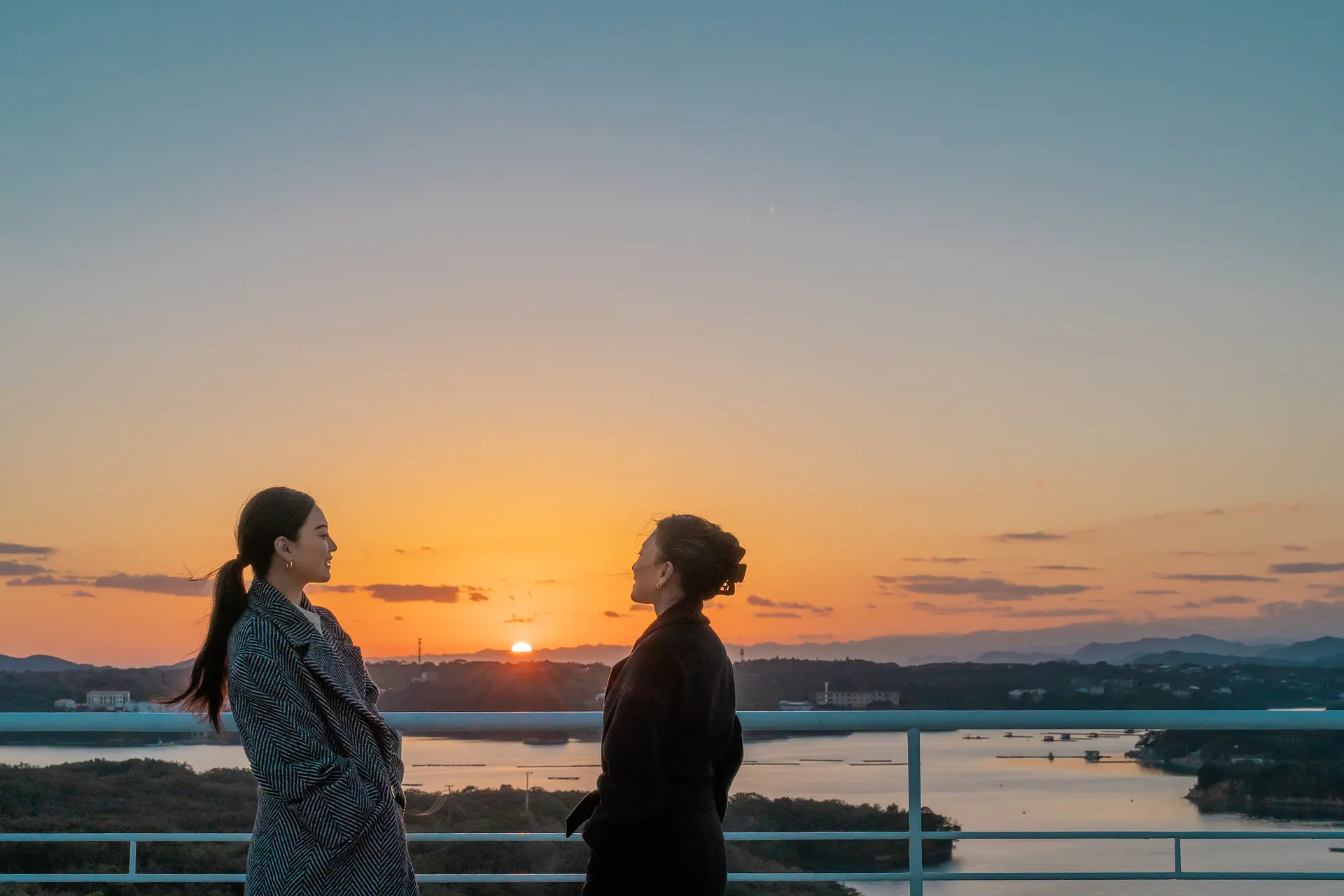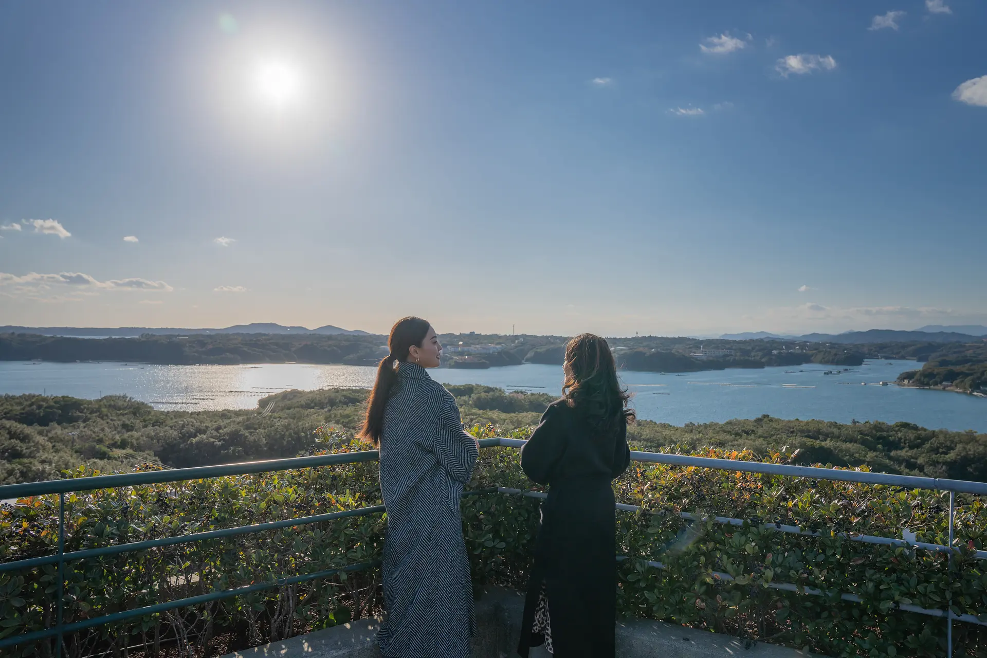 目の前に広がる美しい英虞湾を眺めるふたり。ゆったりと過ぎていく時間に心が落ちつきます。