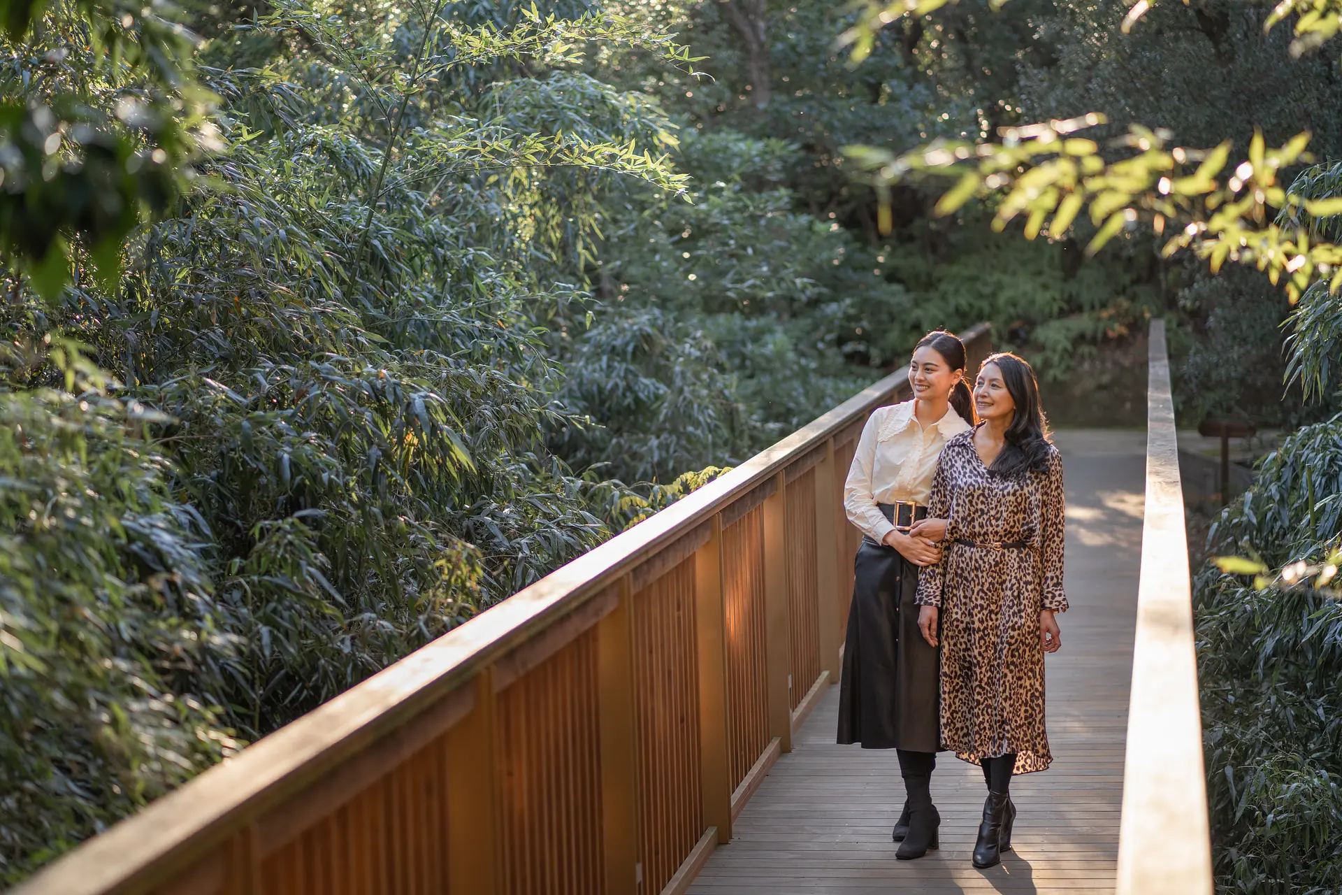 「ザ ベイスイート」「ザ クラシック」「ザ クラブ」は広大な敷地の中、自由に行き来が可能。「ザ ベイスイート」を出て「ザ クラシック」へと向かうふたり。道中にある庭園や、橋の上を歩いていると、木々の間から鳥のさえずりが聞こえてきます。