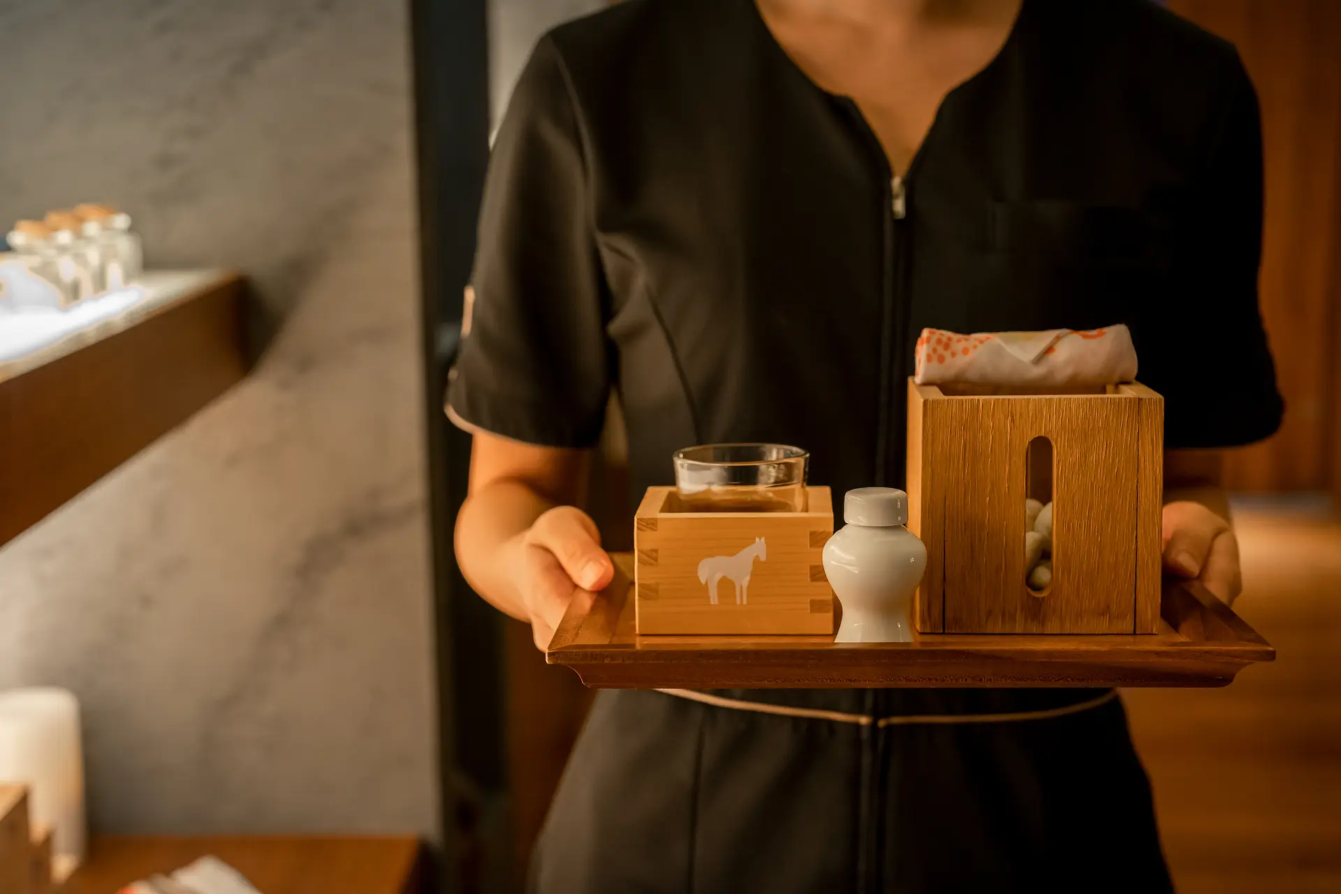 伊勢で神棚や神具を造る「伊勢宮忠」の火打石での「伊勢古来の風習」とされる”切り火”が行われ、その後全身の施術が行われます。
