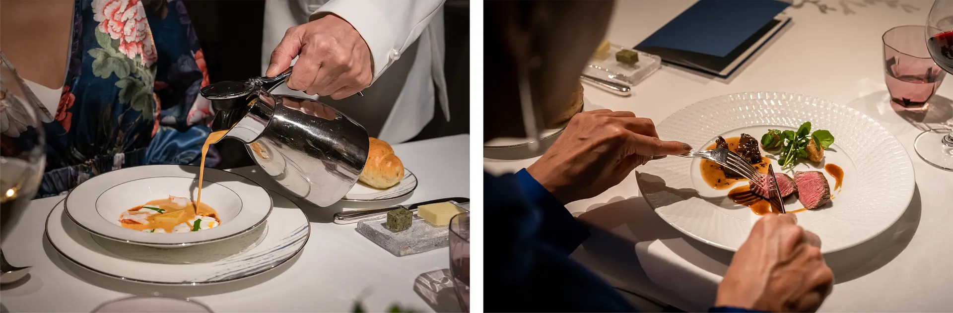 今回いただくのは「エレガンス」コース。志摩観光ホテル伝統メニューの「伊勢海老クリームスープ」は目の前でお皿に注がれると、ふんわりと伊勢海老の濃厚な香りが広がります。