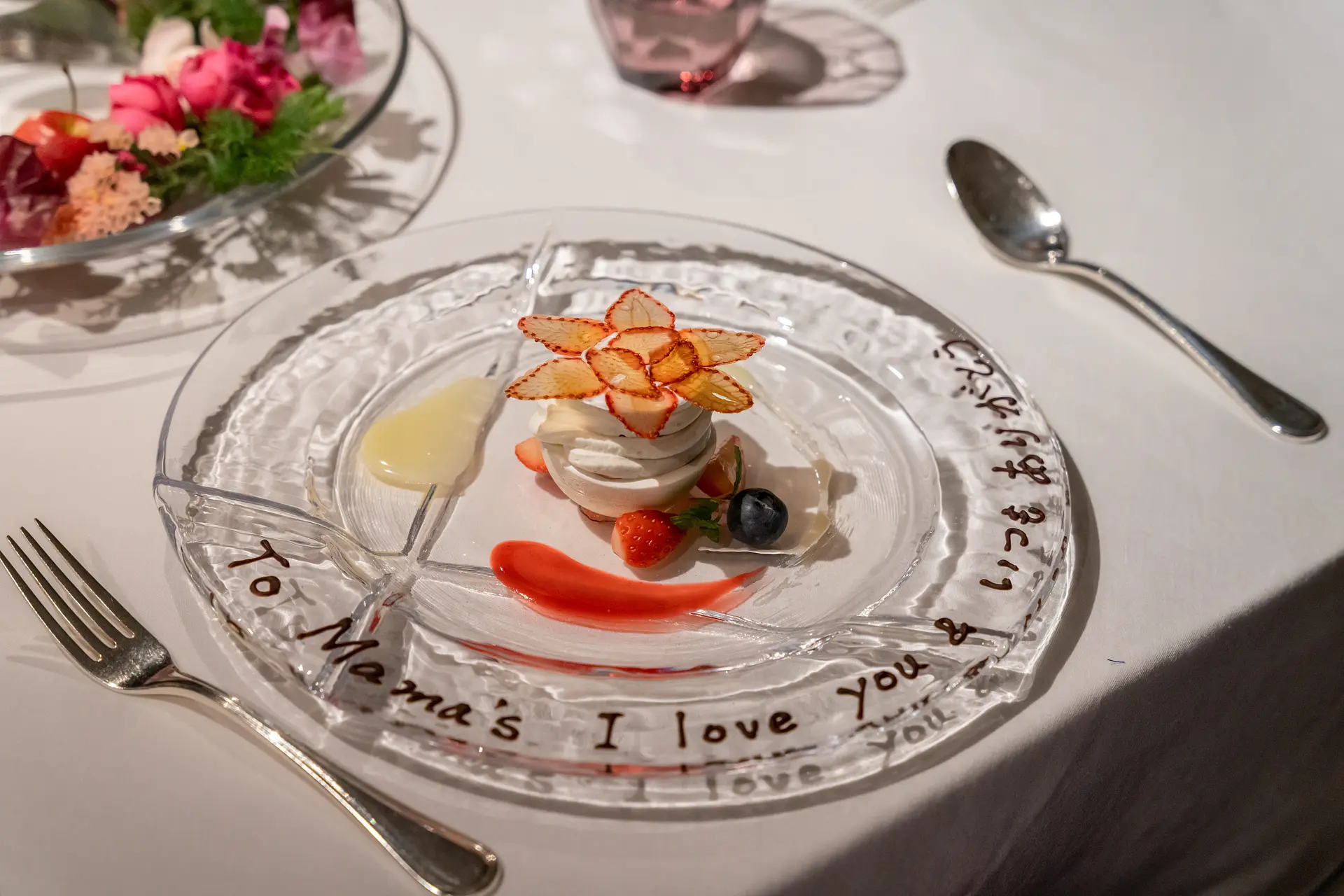 続いてはデザート。ここで母・裕子さんにサプライズ!素敵なメッセージプレートが運ばれてきました。