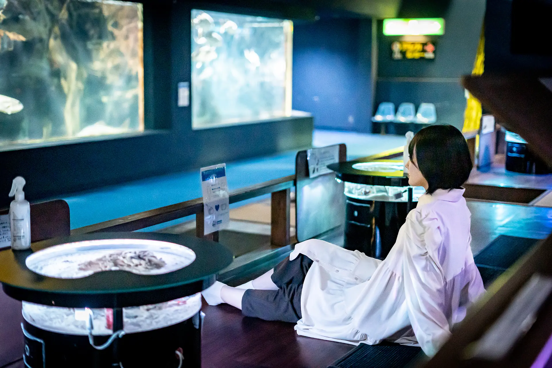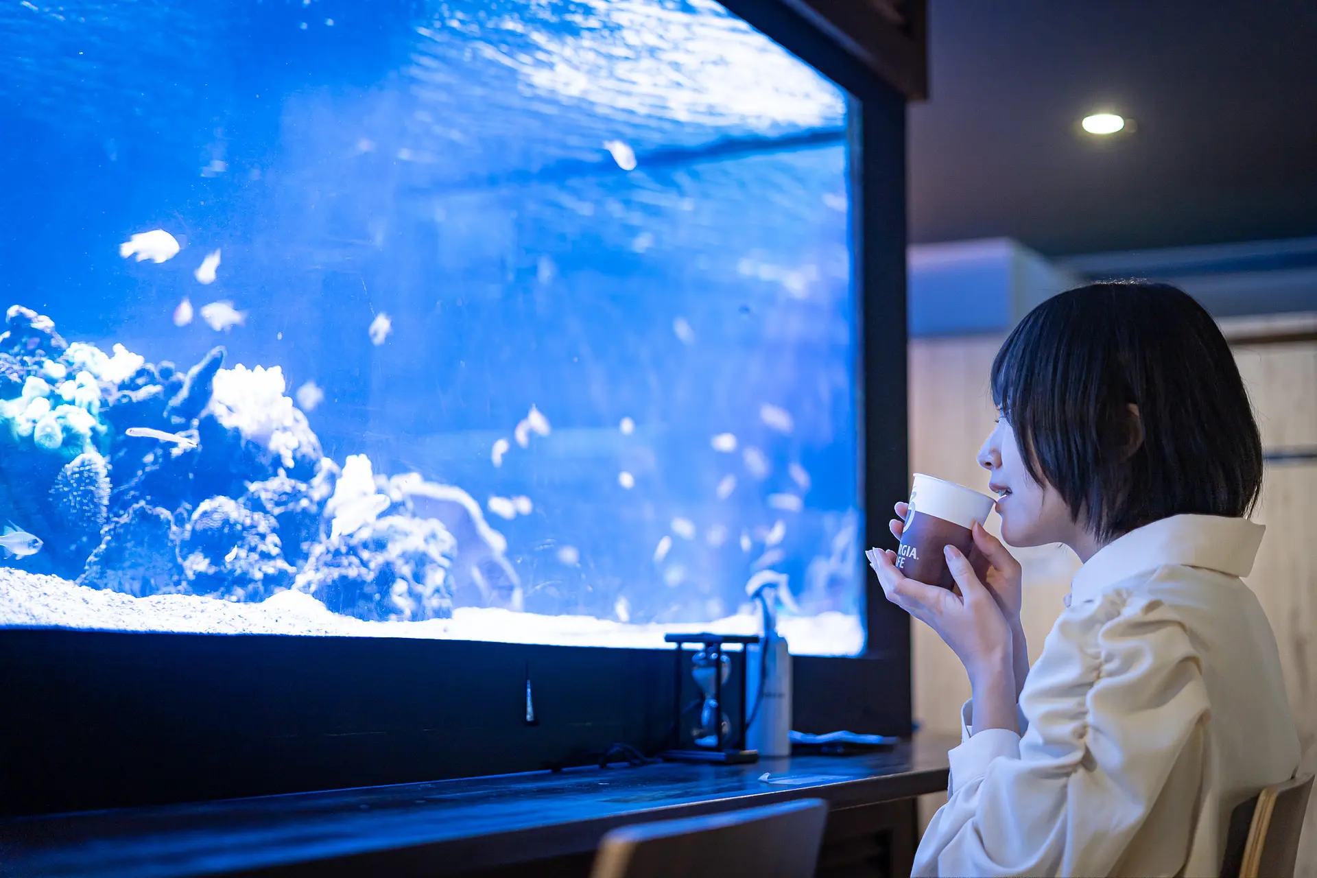「いこいの魚館 UOASIS-ウオアシス‐」では、オシャレなバーのような雰囲気の中で、ゆっくり休憩することができます。