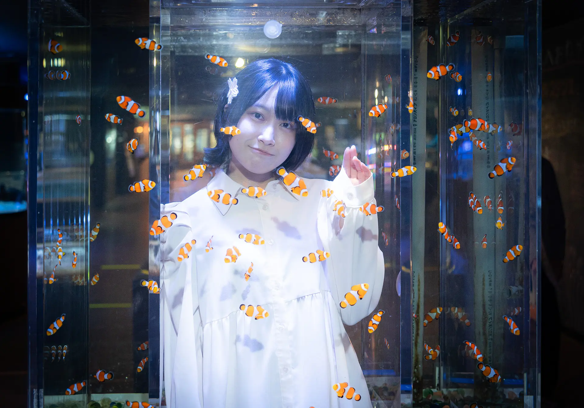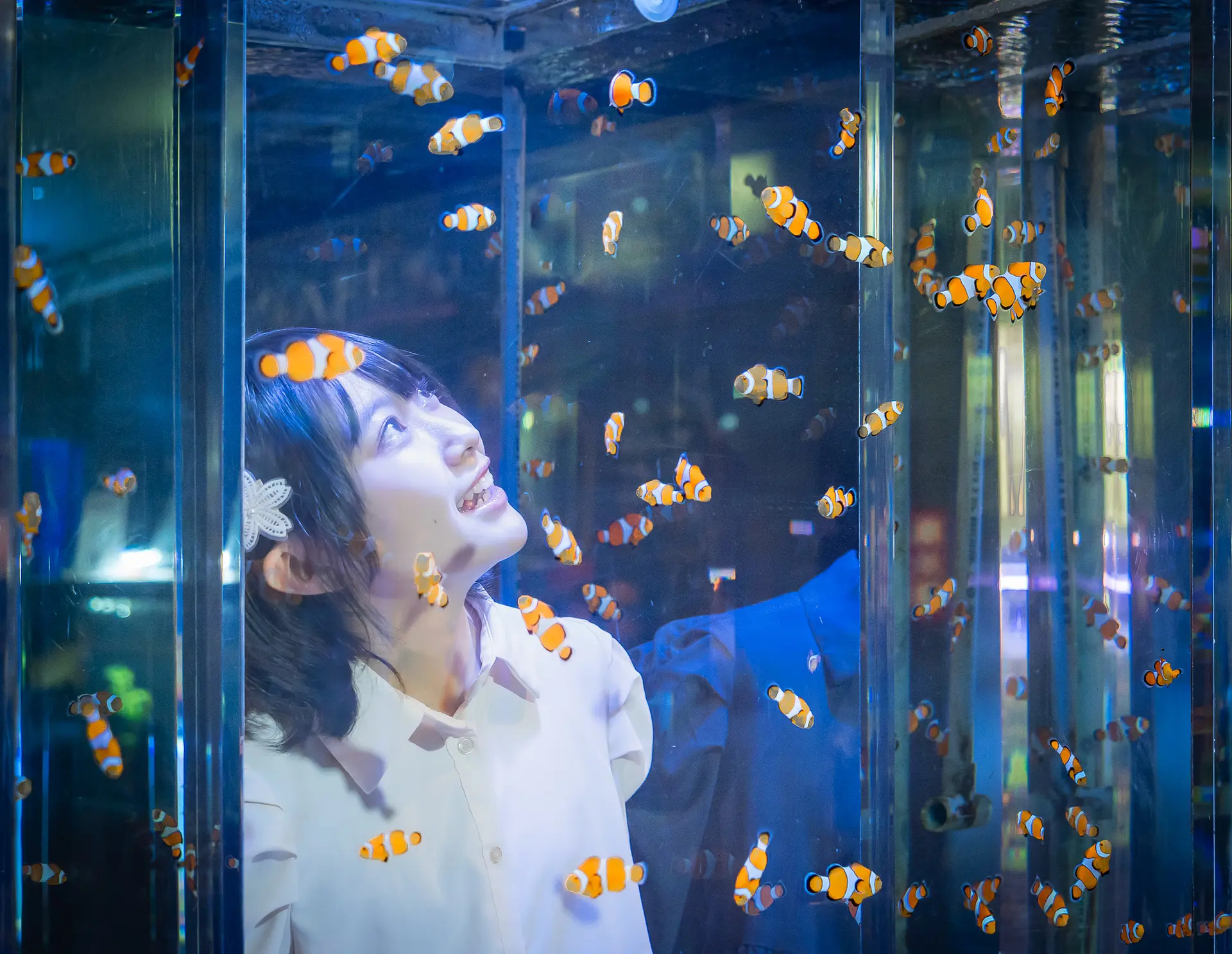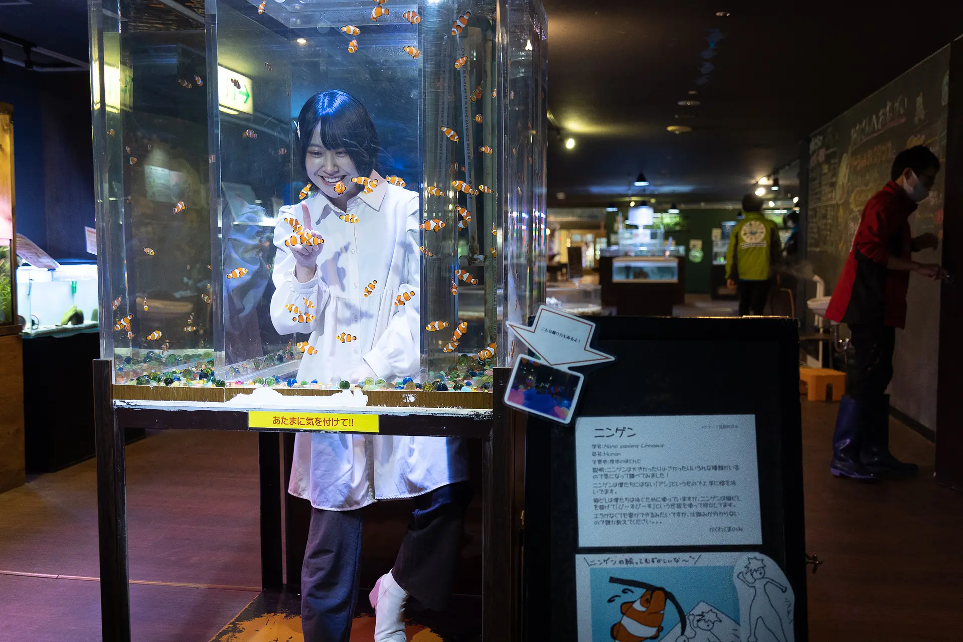 こちらはクマノミが展示されている水槽かと思いきや、実はお客さんがクマノミから見られている面白い水槽なんです。