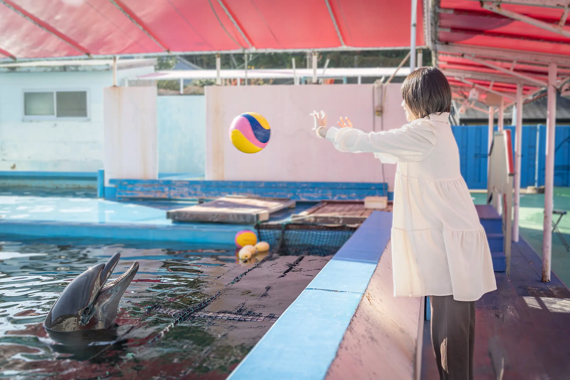 とても遊び好きなイルカたちとは、プールに浮かぶボールを使って一キャッチボールをすることができるんです。