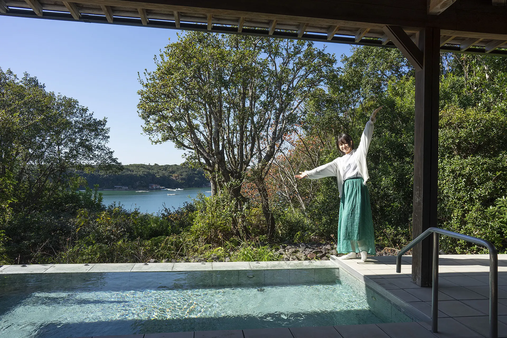 そのうちの一つがこちらの「天の鑑」。英虞湾を一望するこの露天風呂は、その名の通り昼間は志摩の青空を、そして夜には満天の星空を湯に映します。