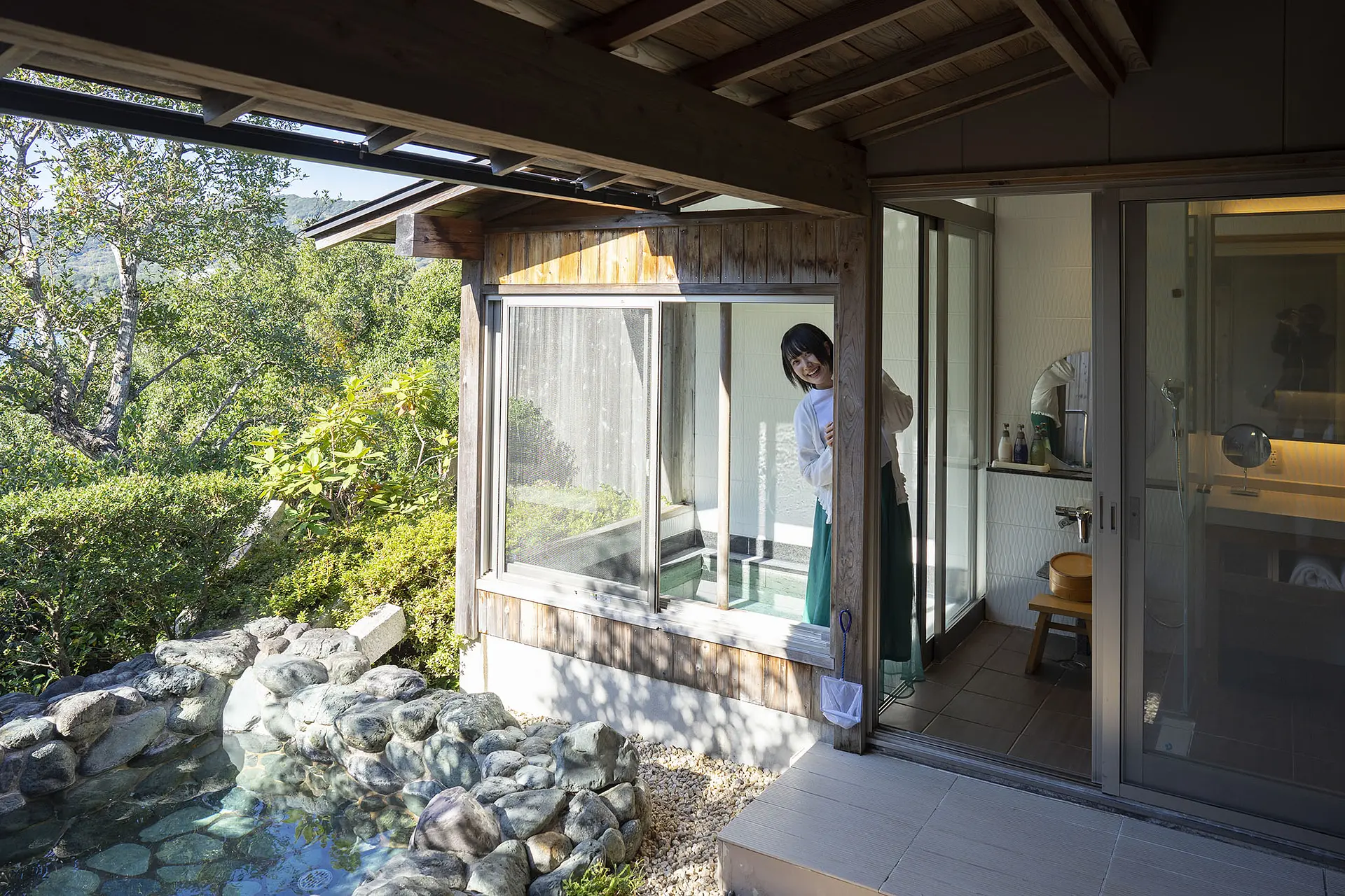 伊勢志摩の英虞湾に面した高台に立つ日本旅館「汀渚ばさら邸」。空間の立体的な広がりを意識してデザインされた客室はすべてしつらえが異なり、全室客室露天風呂付き。