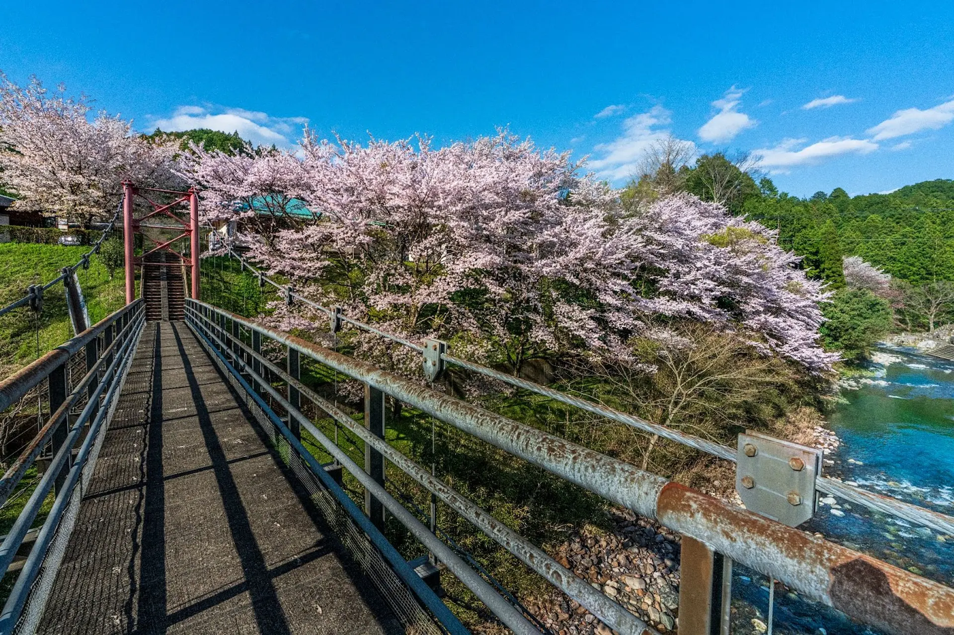 川遊びスポットで紹介した「波瀬駅」近くの川もお花見におすすめ!吊り橋から桜並木を観賞できます。