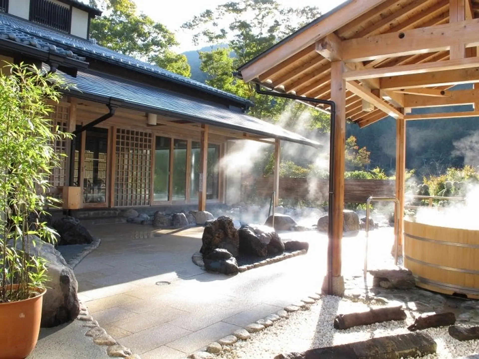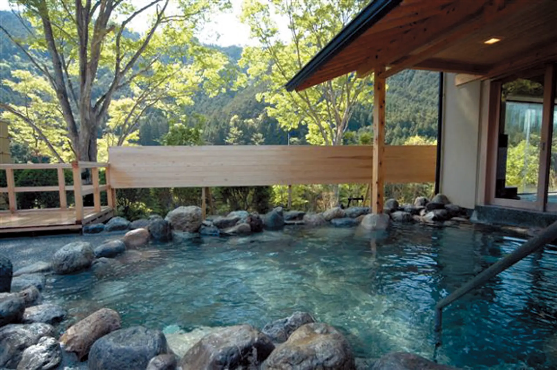 露天風呂や内湯からは香肌峡の大自然を眺めることができ、18槽11種類もの多彩な湯舟を満喫できます。