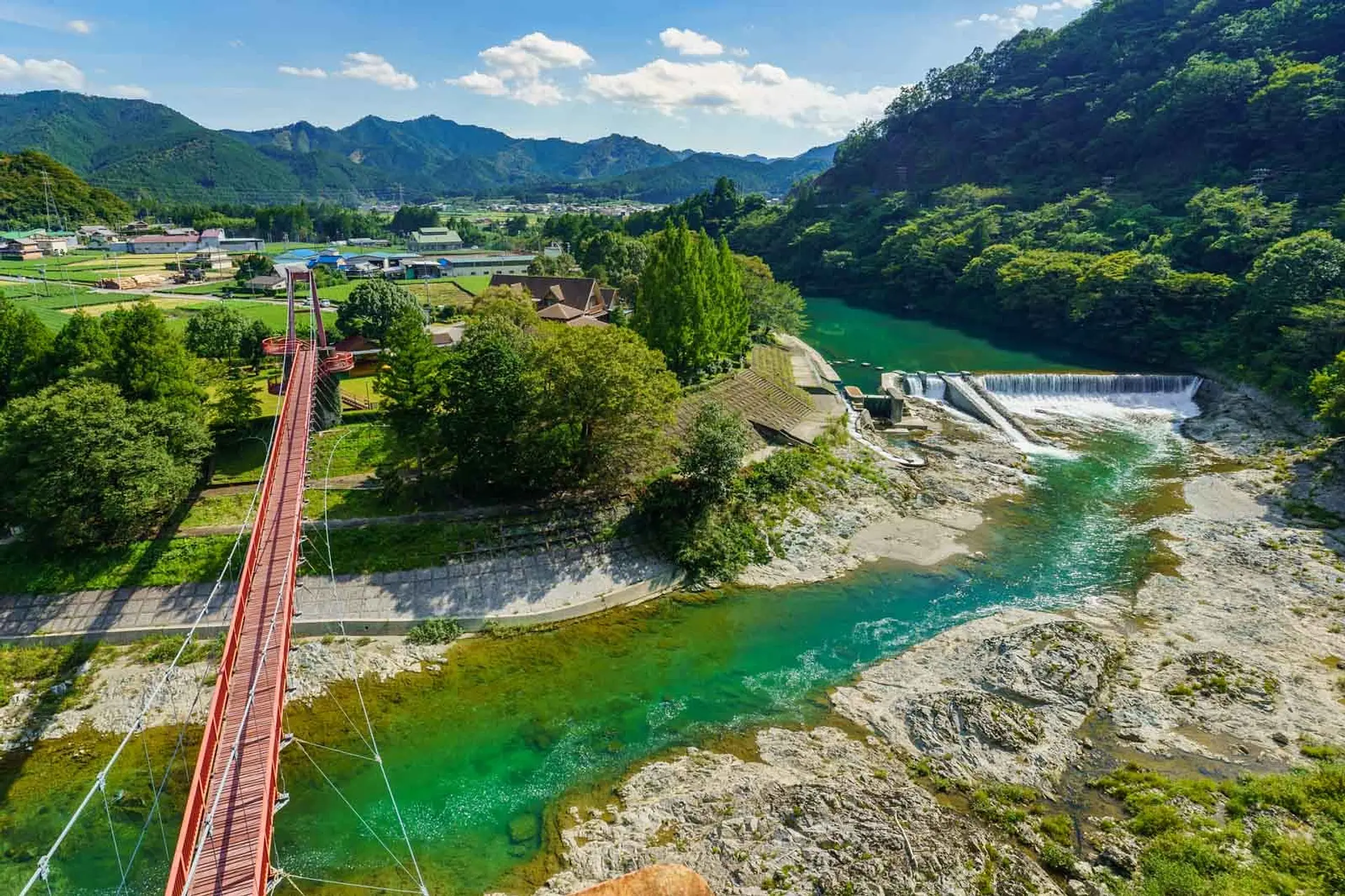 この吊り橋は香肌峡の大自然を間近で観賞できる絶景ポイントであり、エメラルドグリーンに輝く川を眺めることが出来ます。