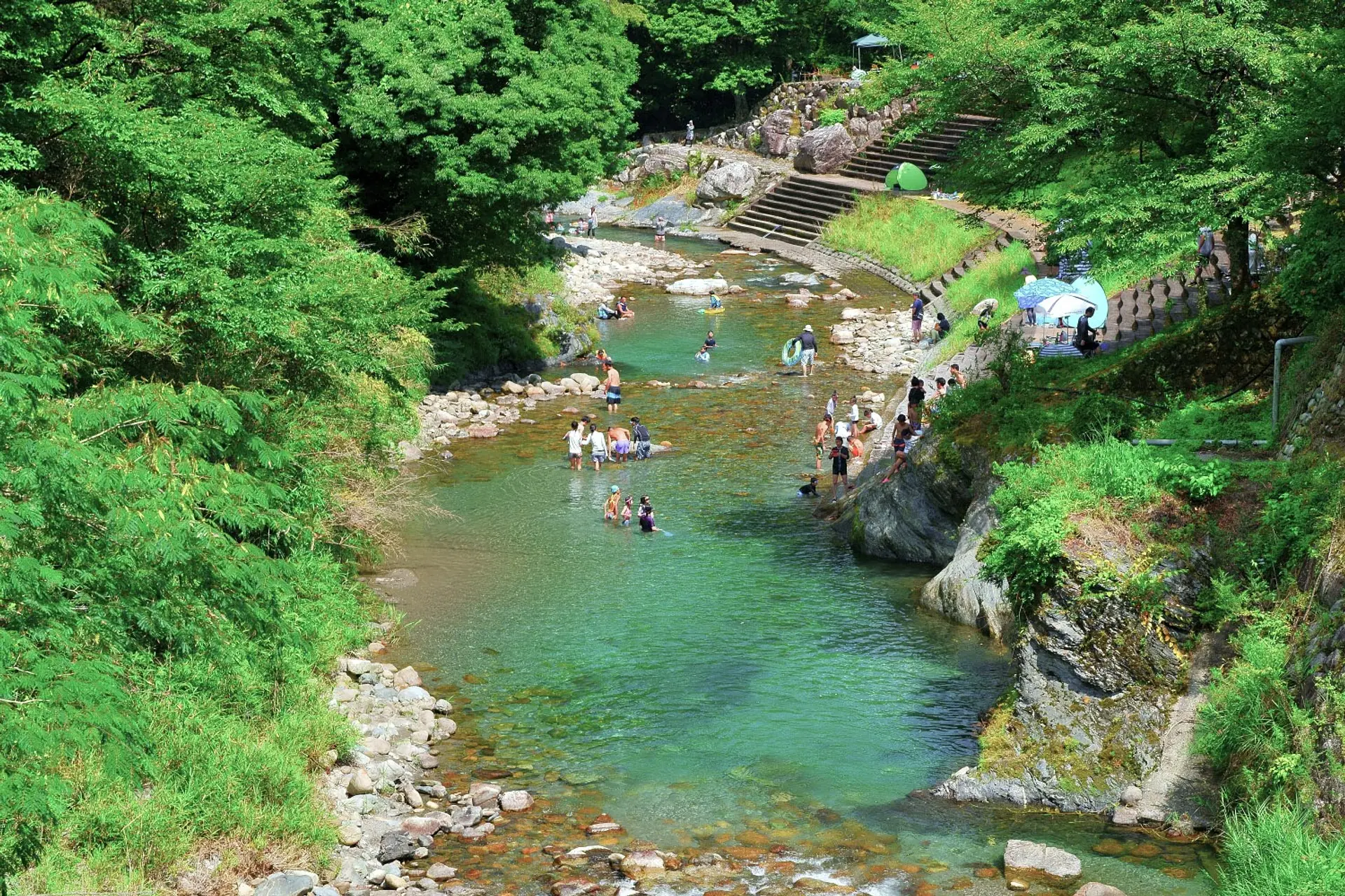 香肌峡には浅瀬で流れの穏やかな箇所が多数あり、夏は川遊びを満喫できます。