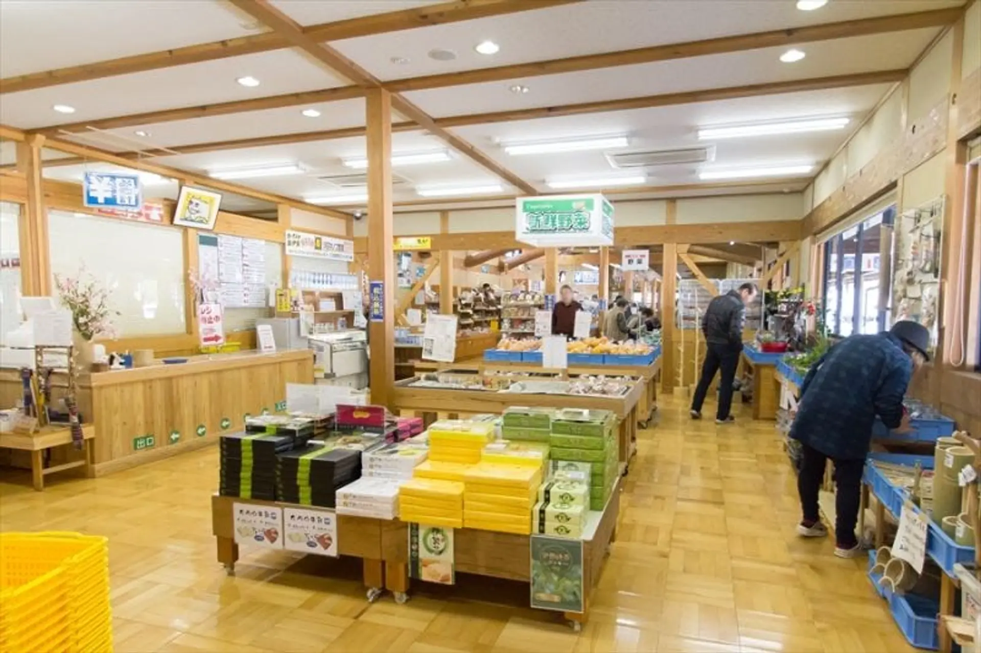 駅舎には地元野菜や特産品、お土産を販売するコーナーがあり、この地域で生産された深蒸し煎茶の品揃えも豊富です。