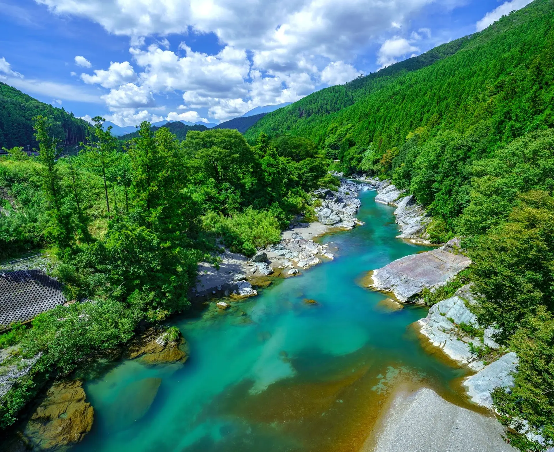 その渓谷美は国道166号から眺めることができ、道沿いにはエメラルドグリーンに輝く櫛田川の清流が流れます。