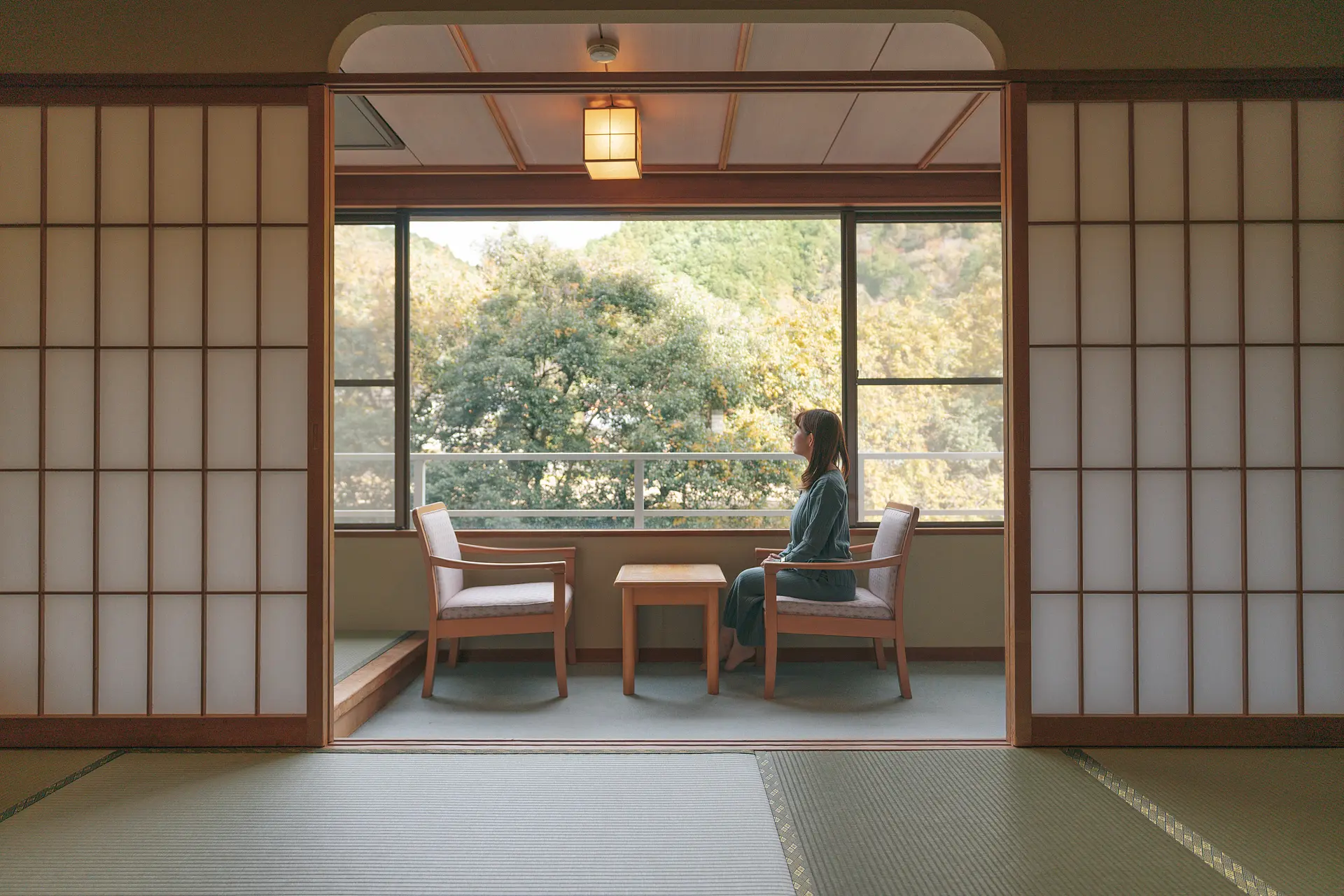 客室は落ち着いた雰囲気の和空間で、ゆるやかな時を過ごすことができます。