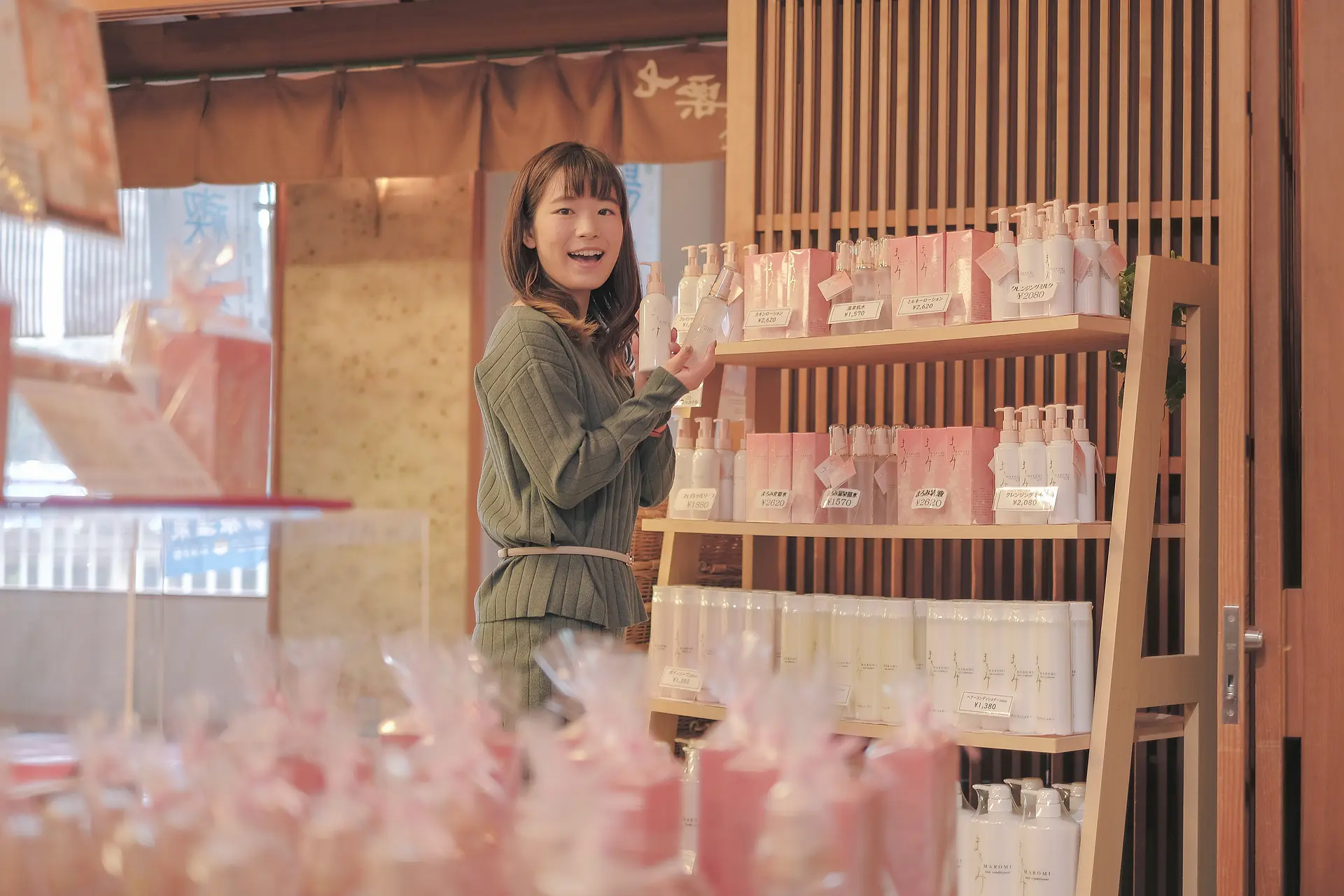 売店には、美白効果の高いアルカリ性源泉を使用したオリジナルシャンプーや化粧水などが販売されていました。