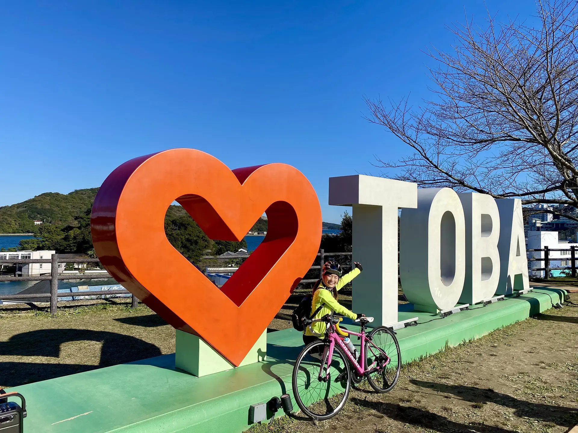 まずは出発を記念して、写真撮影。鳥羽水族館のすぐ目の前にある高台、鳥羽城跡「城山公園」にやってきました。標高40mに位置しているため鳥羽湾が一望できるだけでなく、こちらのハートTOBAモニュメントもフォトスポットとして人気です。