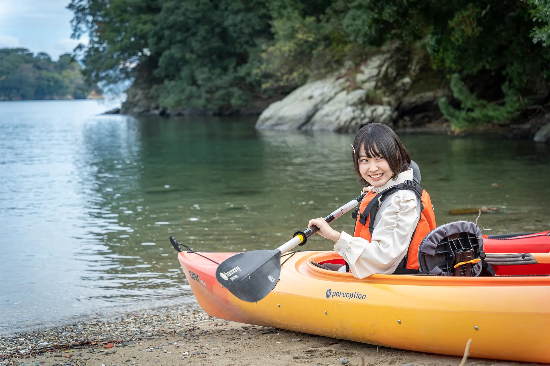 夏川さんもシーカヤックが初めてだったので、基本的な漕ぎ方や方向転換の方法などを丁寧に教えてもらいました。