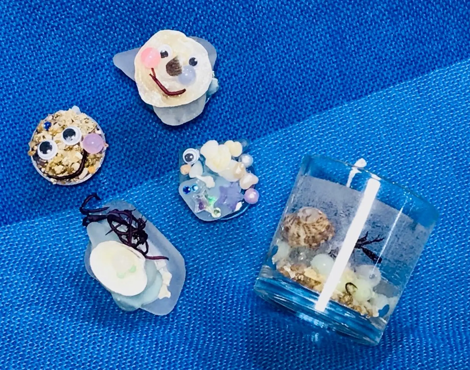 シーグラスとは波で角が削られ丸くなったガラスのことで、こちらのクラフト体験ではこのシーグラスや貝殻を使ってマグネットやブレスレット等のアクセサリー、ジェルキャンドルを手作りすることができます。