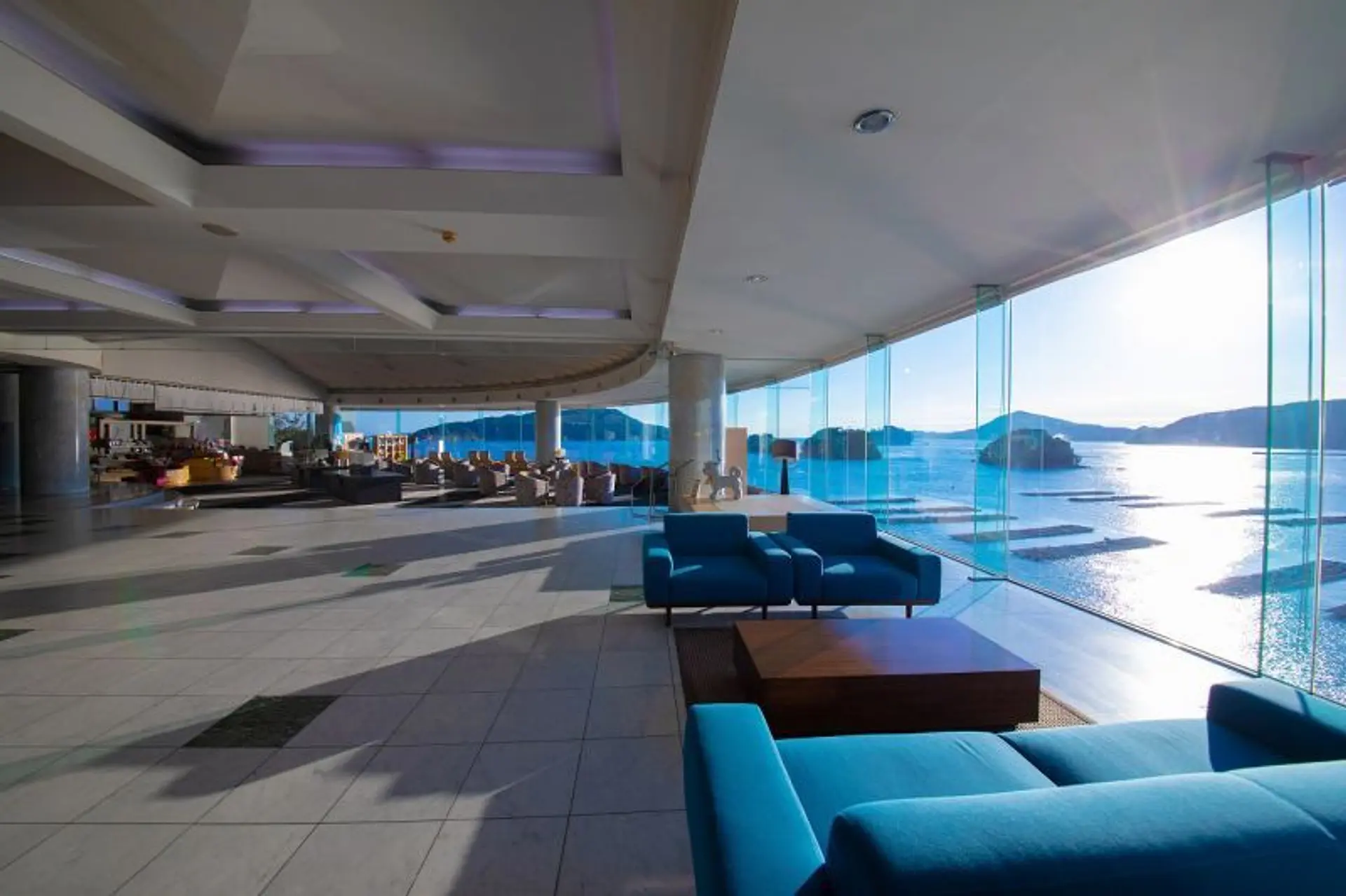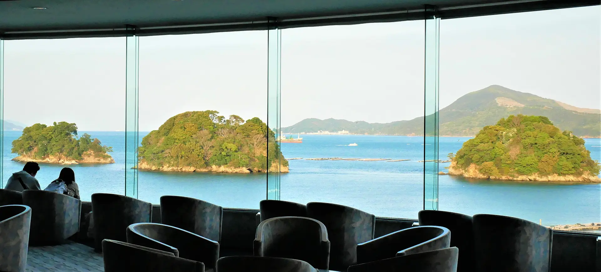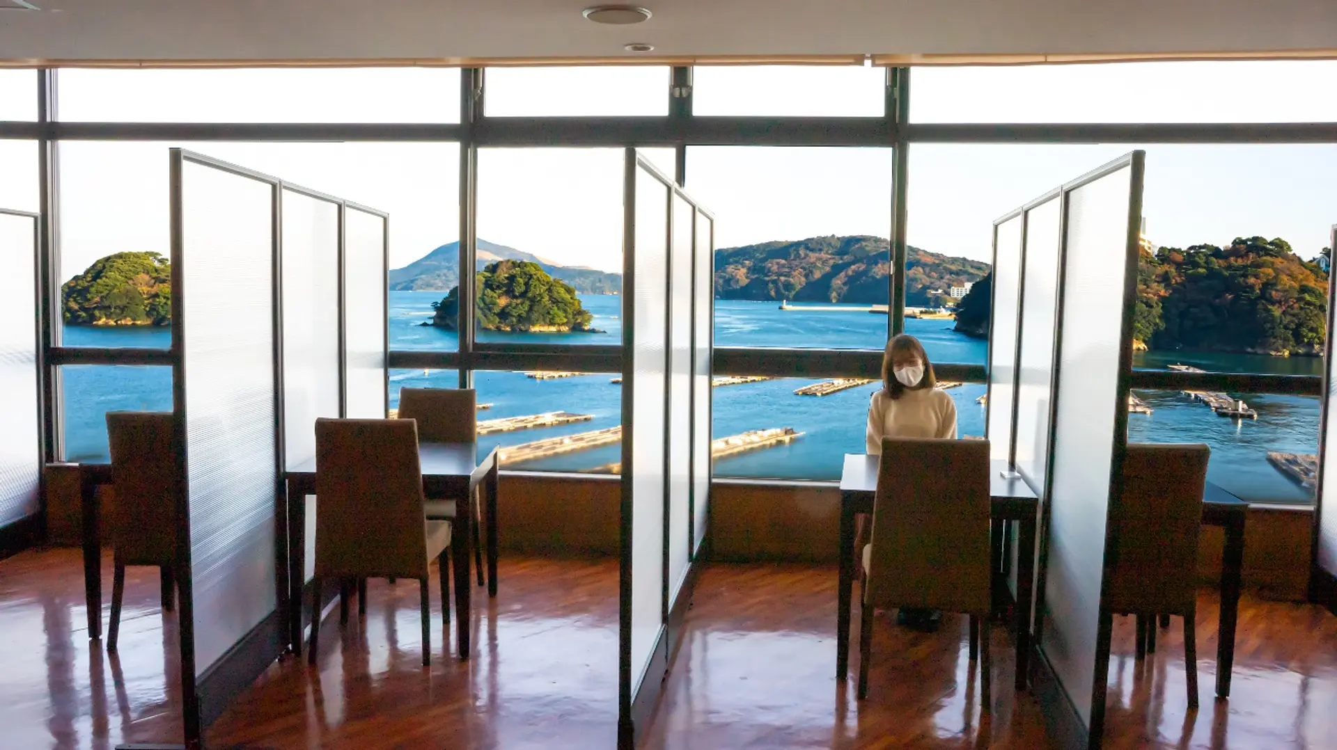 広々したロビーはご覧の通り180度絶景パノラマ!キラキラ光る海に「三ツ島」と筏が浮かび、鳥羽らしい景色を眺めながら、ゆっくり過ごすことができます。