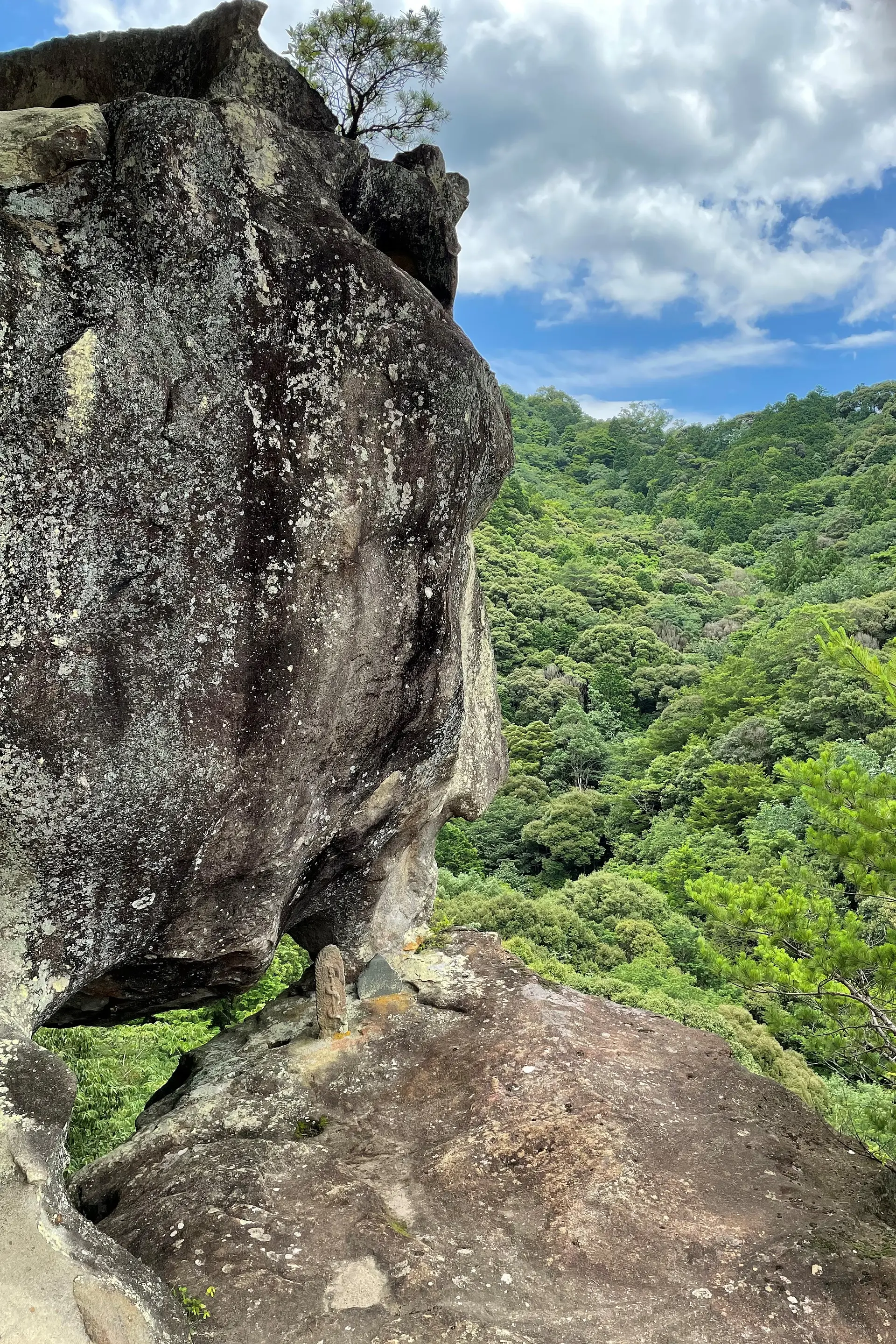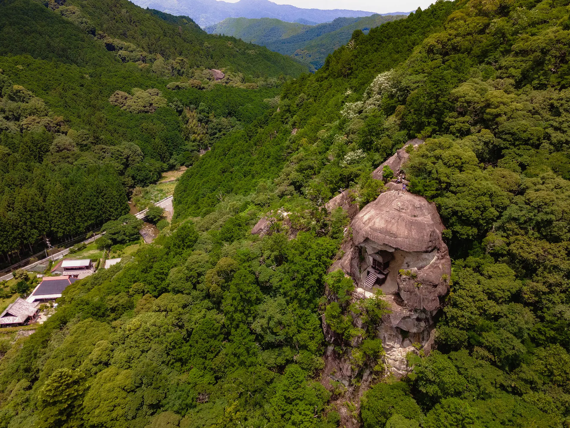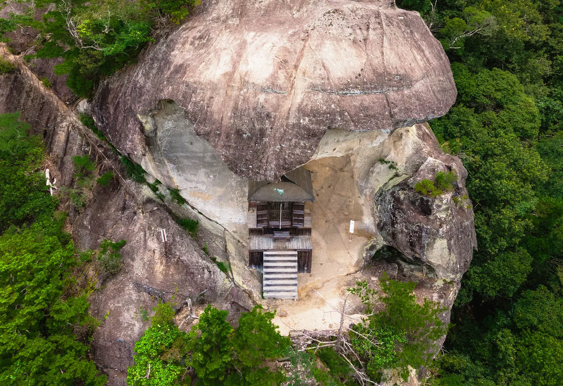 周辺には、県指定名勝にもなっている「伊勢山上」という大宝元年(701年)に開設された修験者(山伏)のための霊場・修行の場があり、「岩屋本堂(いわやほんどう)鐘掛」をはじめ「油こぼし」など多くの行場が今もなお残っています。大自然の中、この不思議な形をした岩の中に「岩屋本堂鐘掛」があります。
