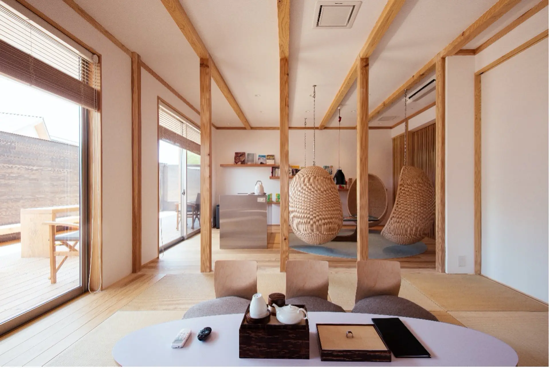 個性的な間取りと、天井から吊り下げられた椅子などの家具が特徴で、非日常的な雰囲気を味わえます♪