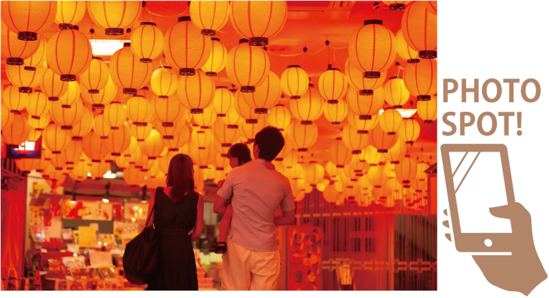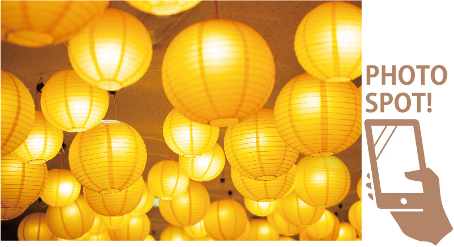 ショップやレストランが並ぶ館内の天井には、「夫婦岩」にちなみ大小2つが1組になった「めおとちょうちん」が張り巡らされていて、とってもきれい♪