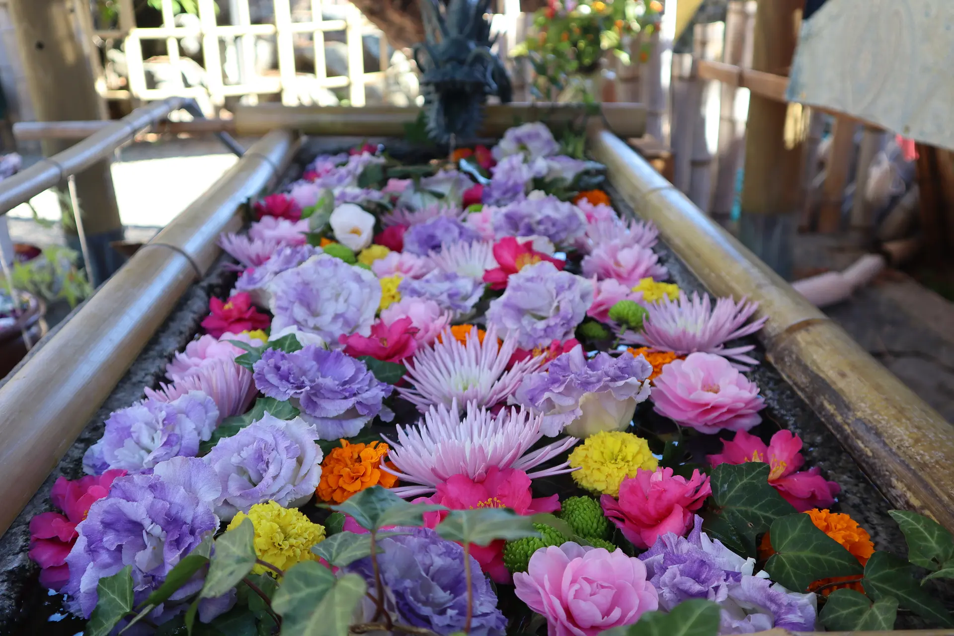 新型コロナウイルス感染防止対策で中止した手水に、竹神社の氏子さんや有志の人が彩り豊かな花を浮かべ作ったもので、「みんなの花手水」と名付けられています。