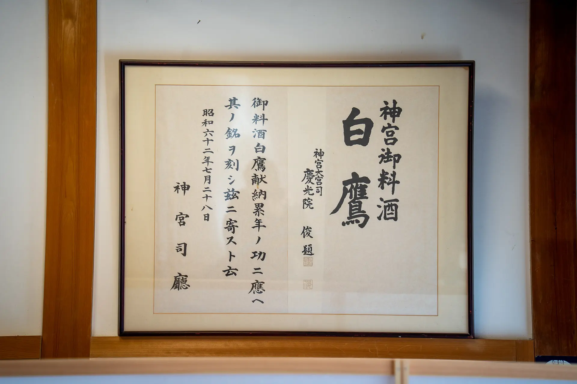 全国に数多くある清酒の中で唯一御料酒として選ばれているのがご存じ「白鷹」なんです。