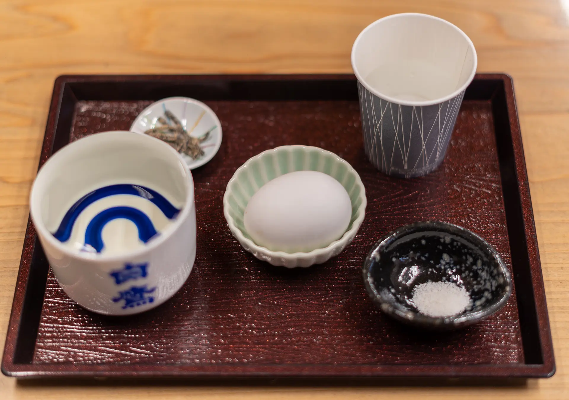 セットには肴として伊勢二見の「岩戸の塩」や、伊勢酒徳昆布の「汐昆布」、「焼きたま」等のこだわりのおつまみがつきます。