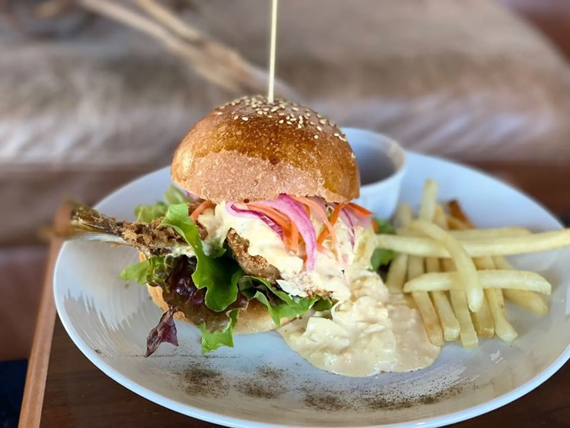 目の前の漁港で水揚げされた魚を自家製パンで挟んだハンバーガーや、伊勢どりを使用したバターチキンカレーを味わうことができます。