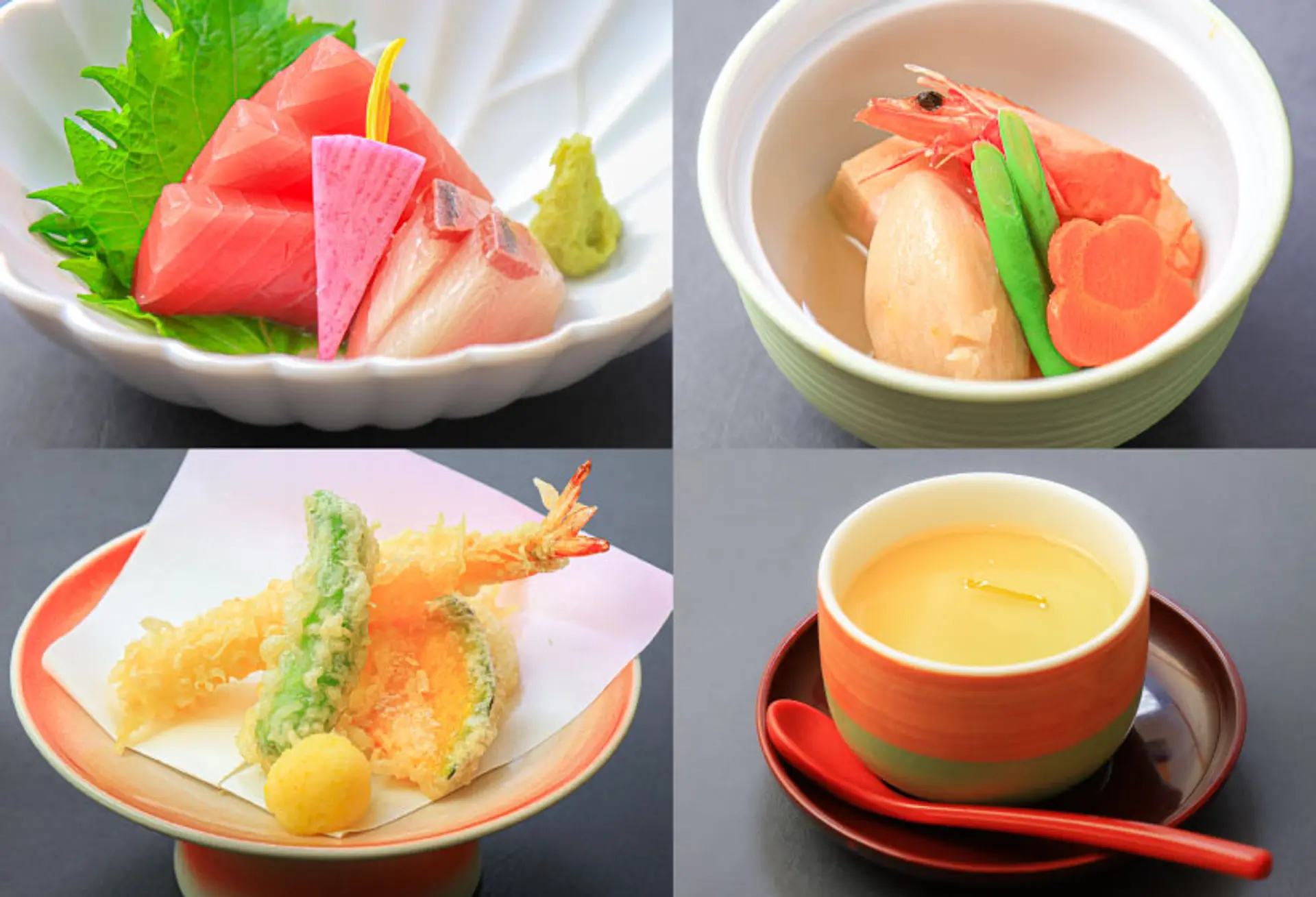 お造り・煮物、茶碗蒸し・天ぷら、ご飯、味噌汁と、品数も豊富です♫