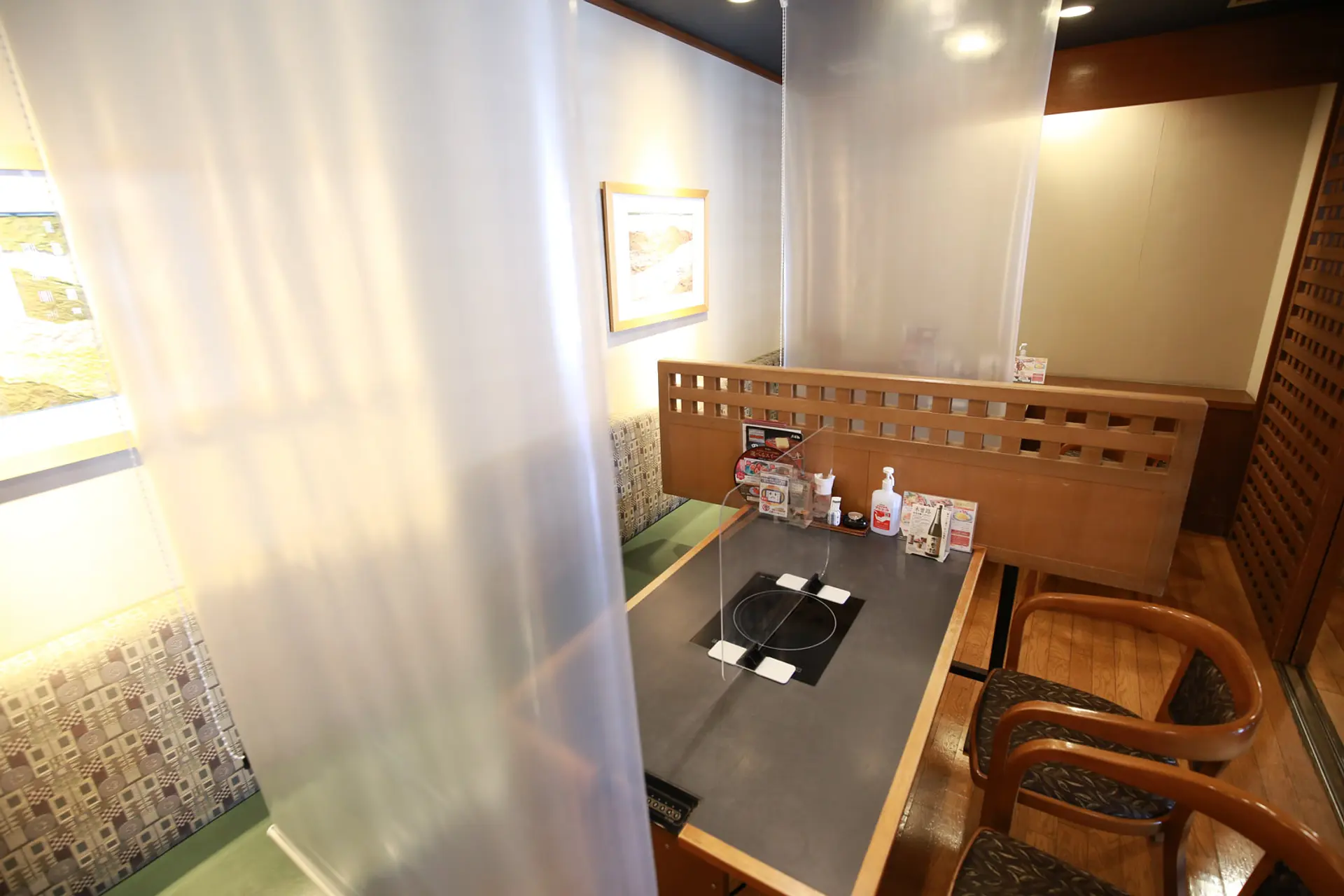 全テーブル席と各個室には消毒液とアクリル版の設置を行い、テーブル席の間には飛沫防止カーテンを設置しています。