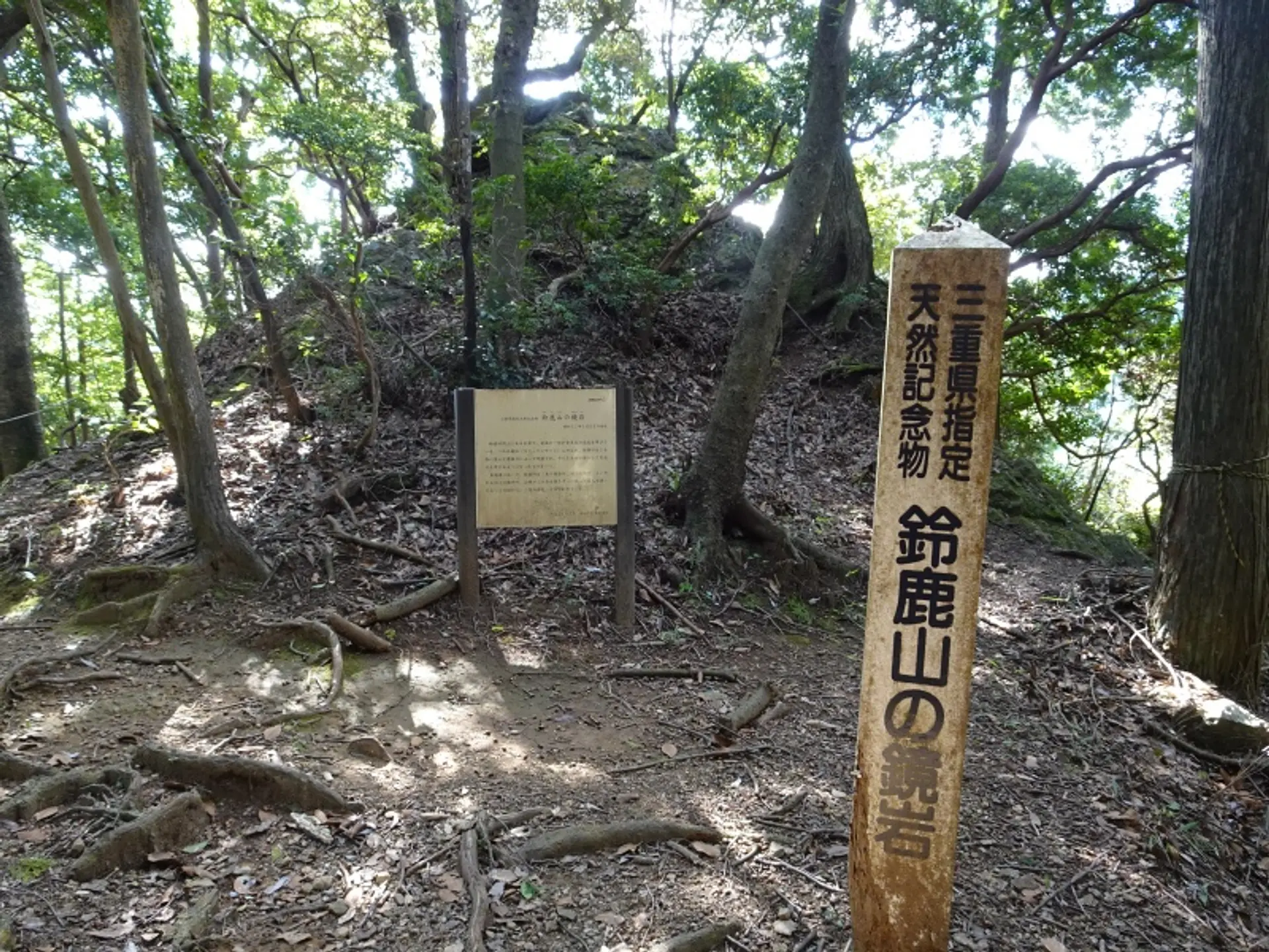 「鈴鹿山の鏡岩」の標識と看板が立っています。鏡岩は看板の後ろにあり、備え付けのロープを伝って岩の上に登れます。