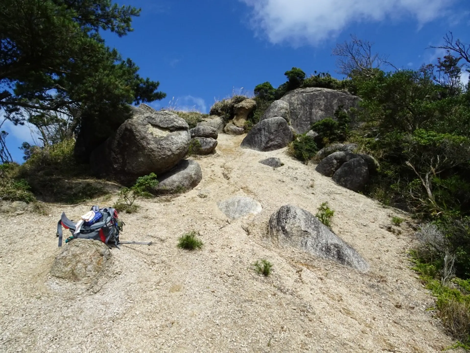 ナイフの刃のように尖った尾根道をナイフエッジと呼ぶのですが、高畑山の登山道には岩場と砂礫のナイフエッジがあります。道中は足幅の狭い箇所や、備え付けのトラロープを伝って岩場を登る箇所があるなどスリル満点です。
