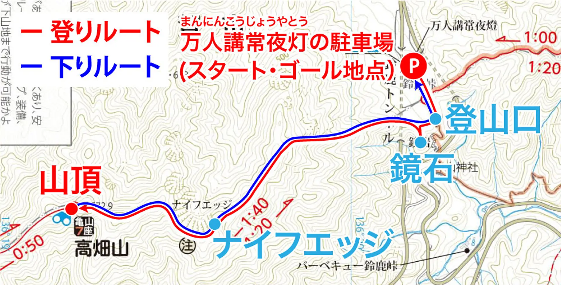 【登りのルート】 万人講常夜燈 駐車場(7:56) ➞ 登山口(8:02) ➞ 鏡岩(8:05) ➞ ナイフエッジ(8:58) ➞ 山頂(9:25)