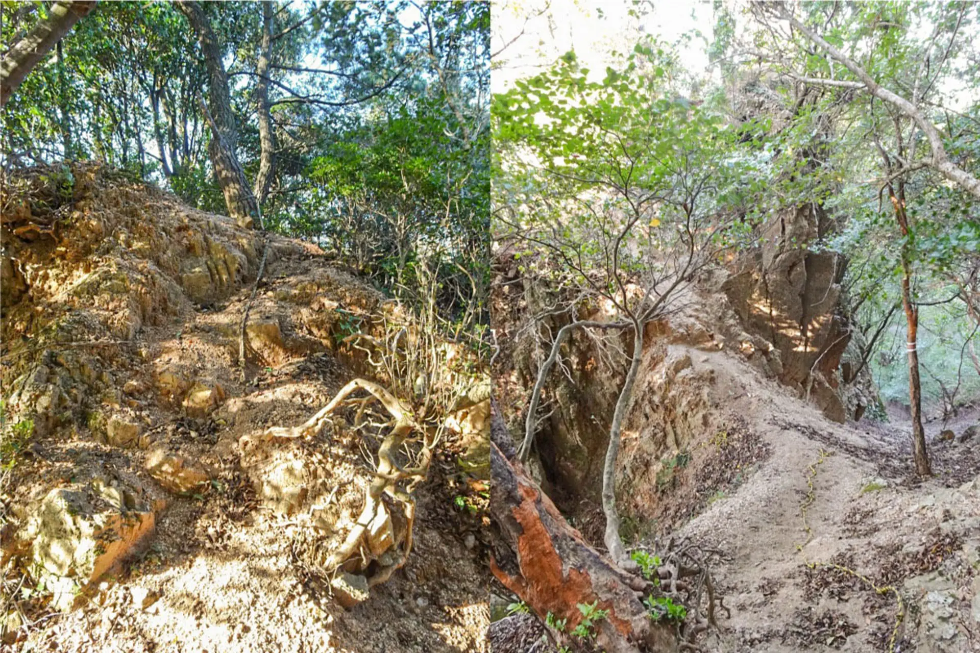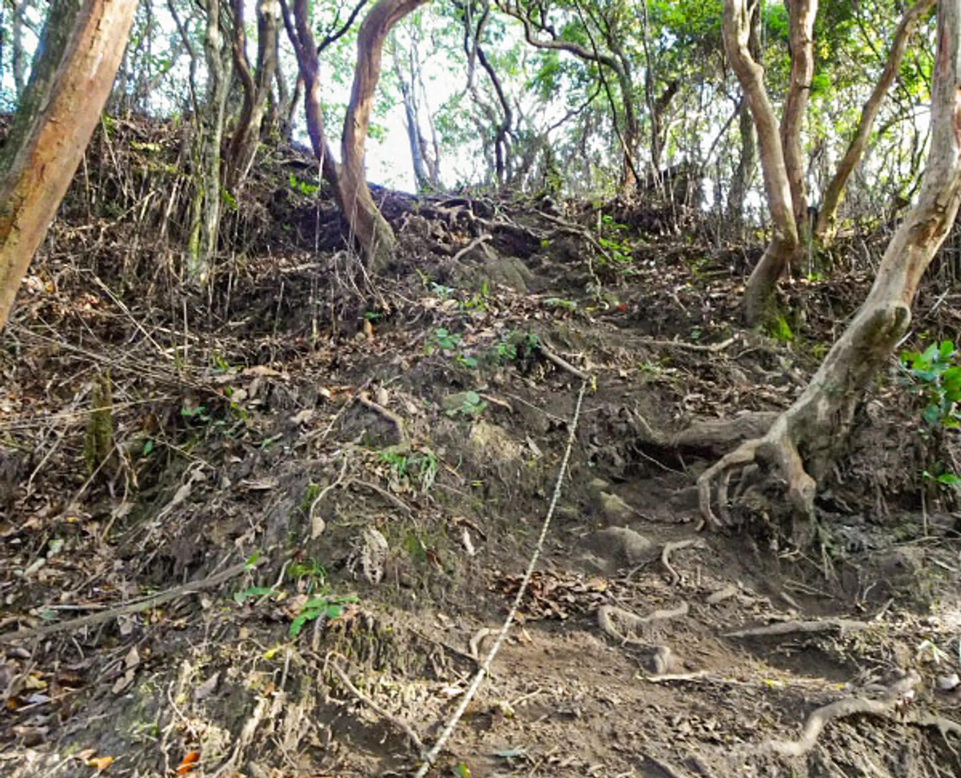 四方草山の南峰まであともう一息のところで急斜面が訪れます。三点支持を確保し、安定した岩や太い木の根をホールドしながら登りましょう。備え付けのトラロープはあくまでも補助的な役割ですので頼りすぎないように。