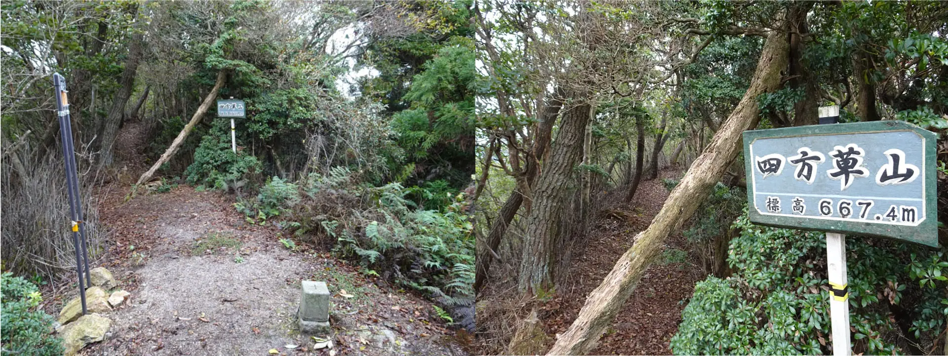 四方草山(しおそやま)は北峰・南峰からなる標高667mの山です。亀山7座の中では6番目に高い山で、標高が最も低い三子山(みつごやま)を経由して行くことができます。三子山の北峰〜四方草山の山頂(北峰)までのコースタイムは約70分です。