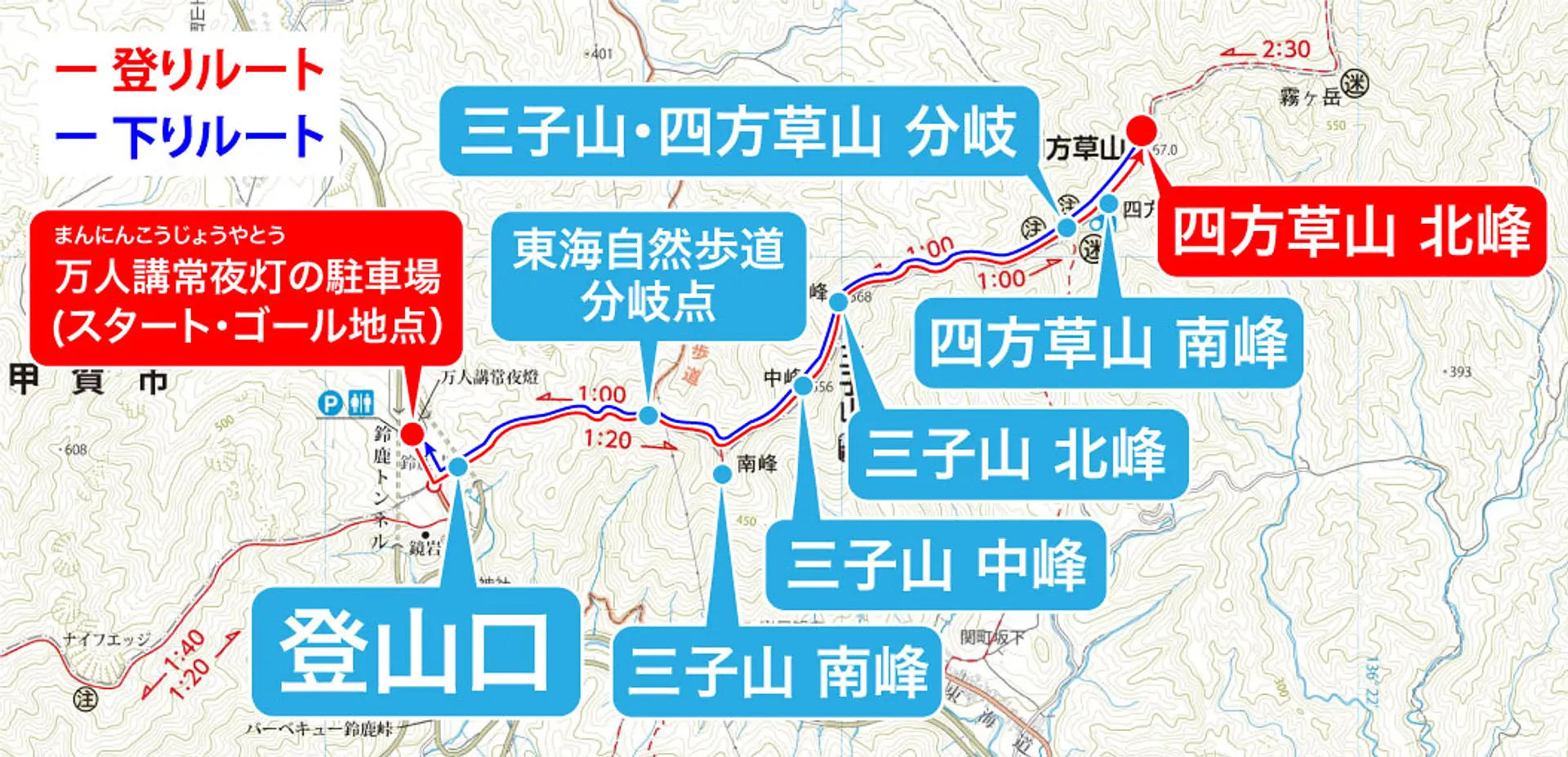 万人講常夜燈(まんにんこうじょうやとう)の駐車場からスタートし、鈴鹿峠の三子山の登山口から三子山を経由して、四方草山の北峰を目指します。途中、四方草山の南峰で食事休憩を取りながら大展望を満喫します。