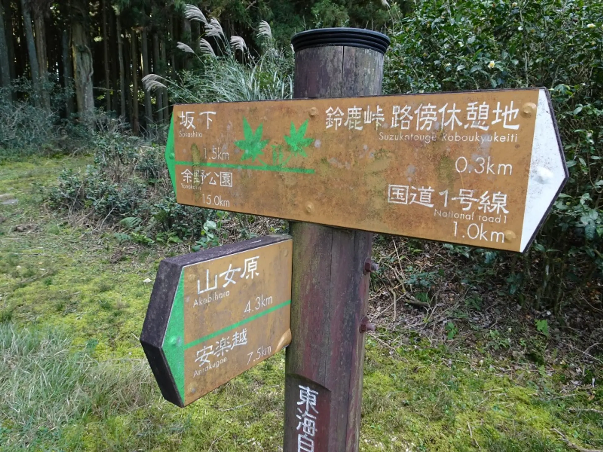 鈴鹿峠の分岐点に到着しました。ここには様々な標識が立っており、初めて方は迷ってしまうポイントかもしれません。三子山の登山口は山女原(あけびはら)の方面にあります。