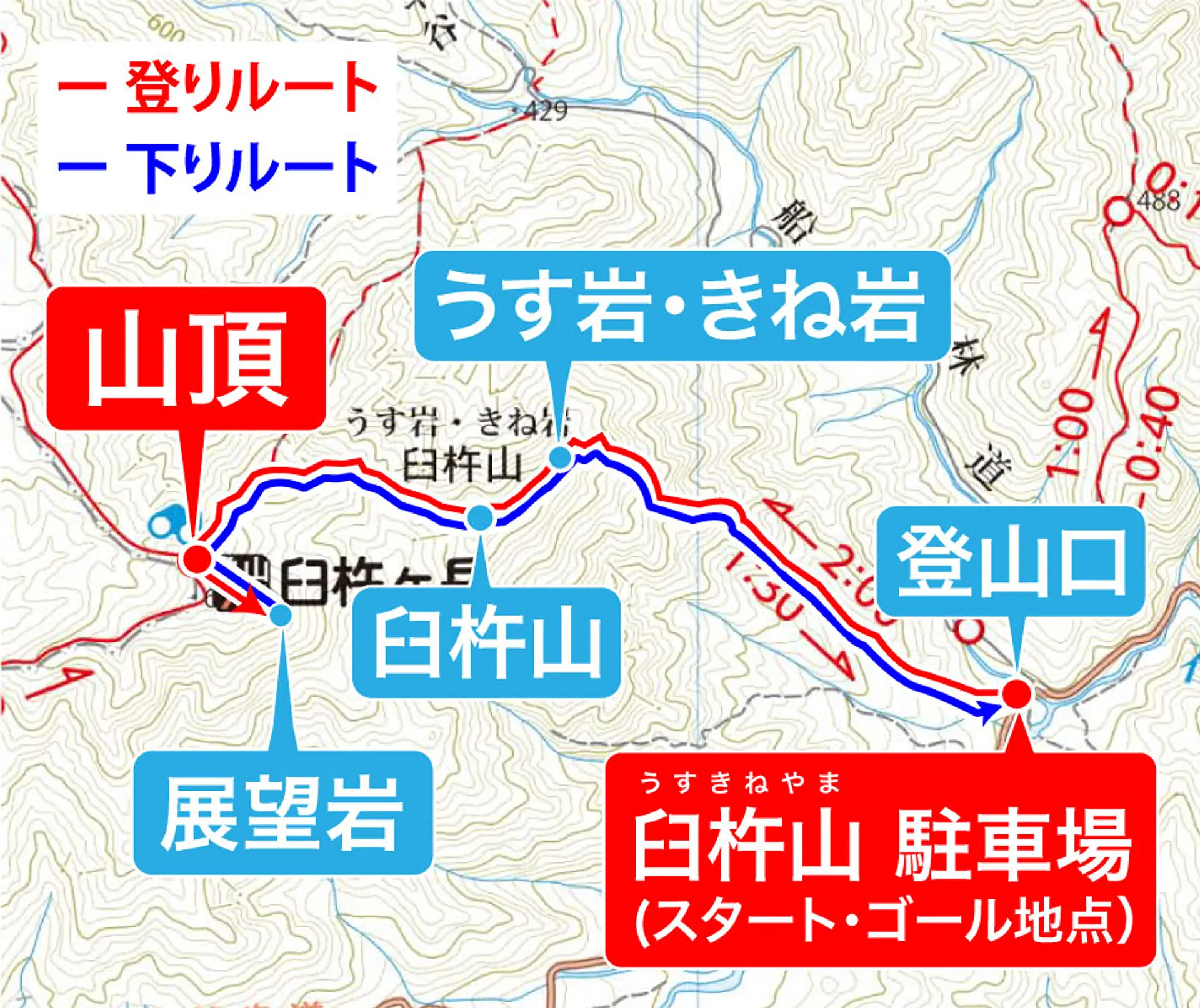 【登りのルート】臼杵山 駐車場(8:40)➞ 臼杵山 登山口(8:41)➞ きね岩・うす岩(9:50)➞ 臼杵山 山頂(10:05)➞ 臼杵ヶ岳 山頂(10:37)➞ 展望岩(10:40)