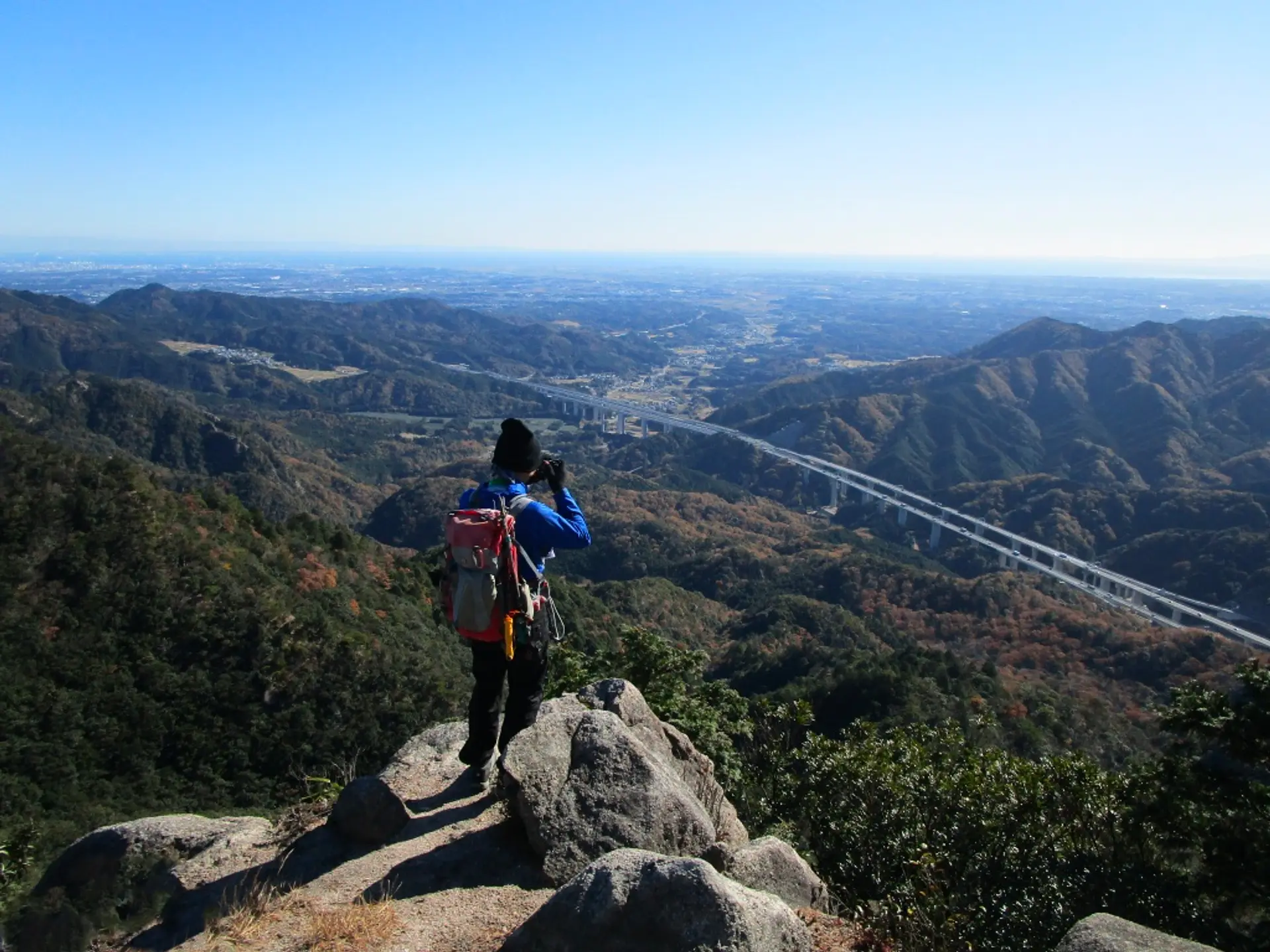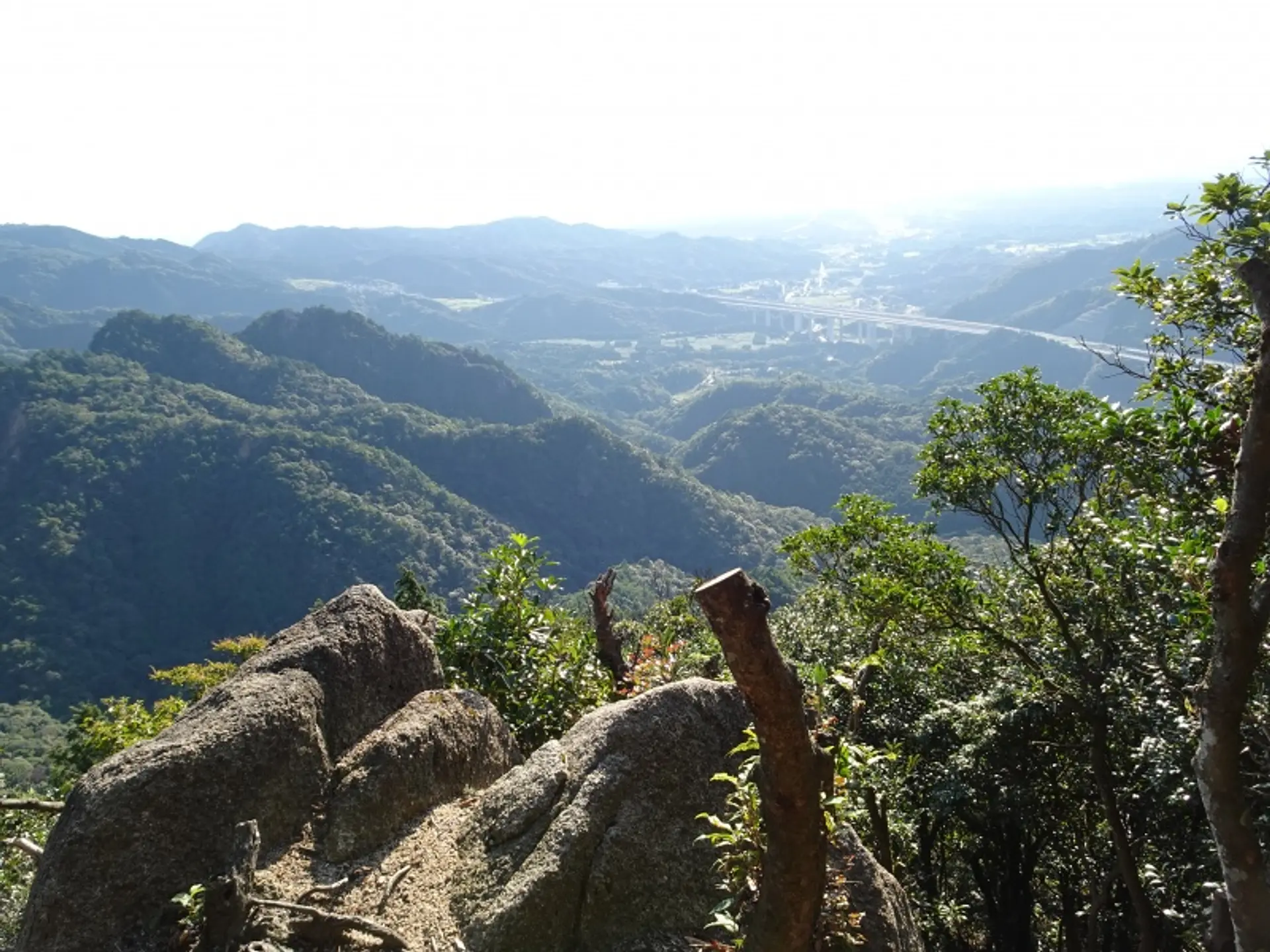 臼杵ヶ岳の山頂付近にある展望岩は亀山7座の中でも屈指の絶景ポイント!三重県亀山市〜津市の町並みと伊勢湾を一望でき、山を横断するように通る新名神高速道路も眼下に見えます。