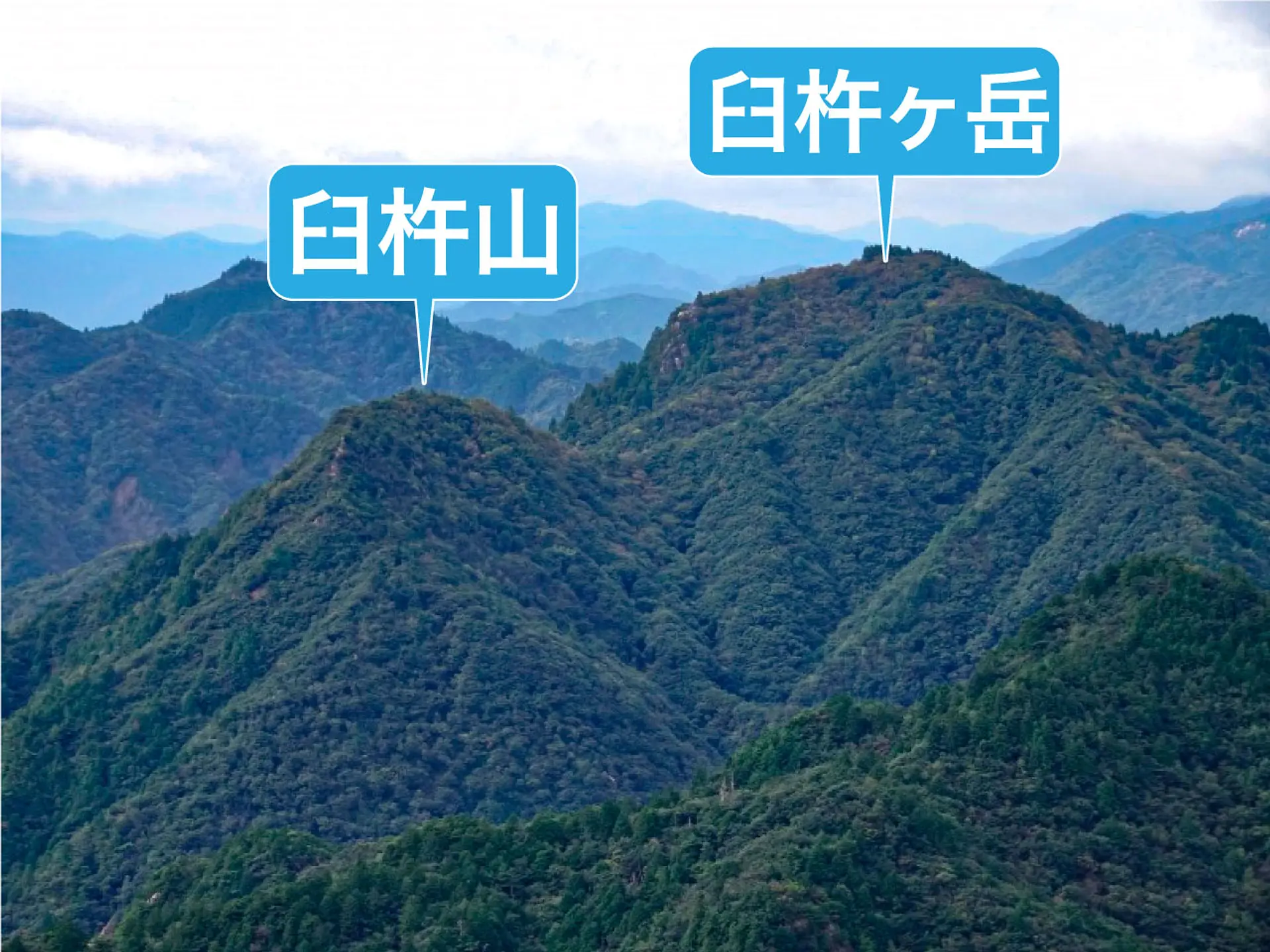 標高630mの臼杵山(うすきねやま)と隣り合う位置関係にあり、この記事で紹介する登山コースでは臼杵ヶ岳と臼杵山の両方を登頂するルートになります。