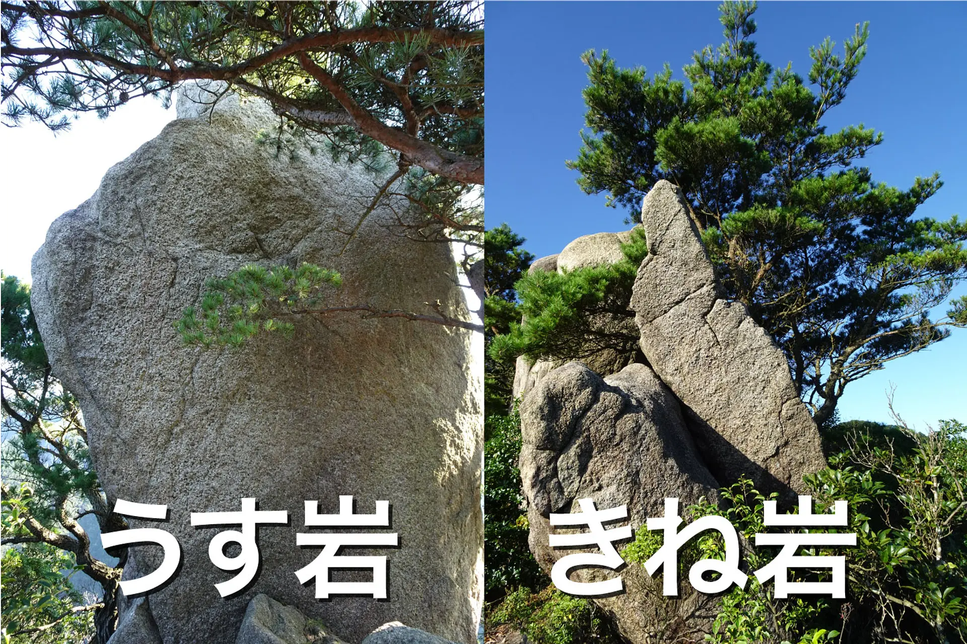 登山道には山名の由来になっている「うす岩」と「きね岩」があり、巨大な花崗岩がそびえ立つ姿は圧巻!ここからの見晴らしも良好ですよ。