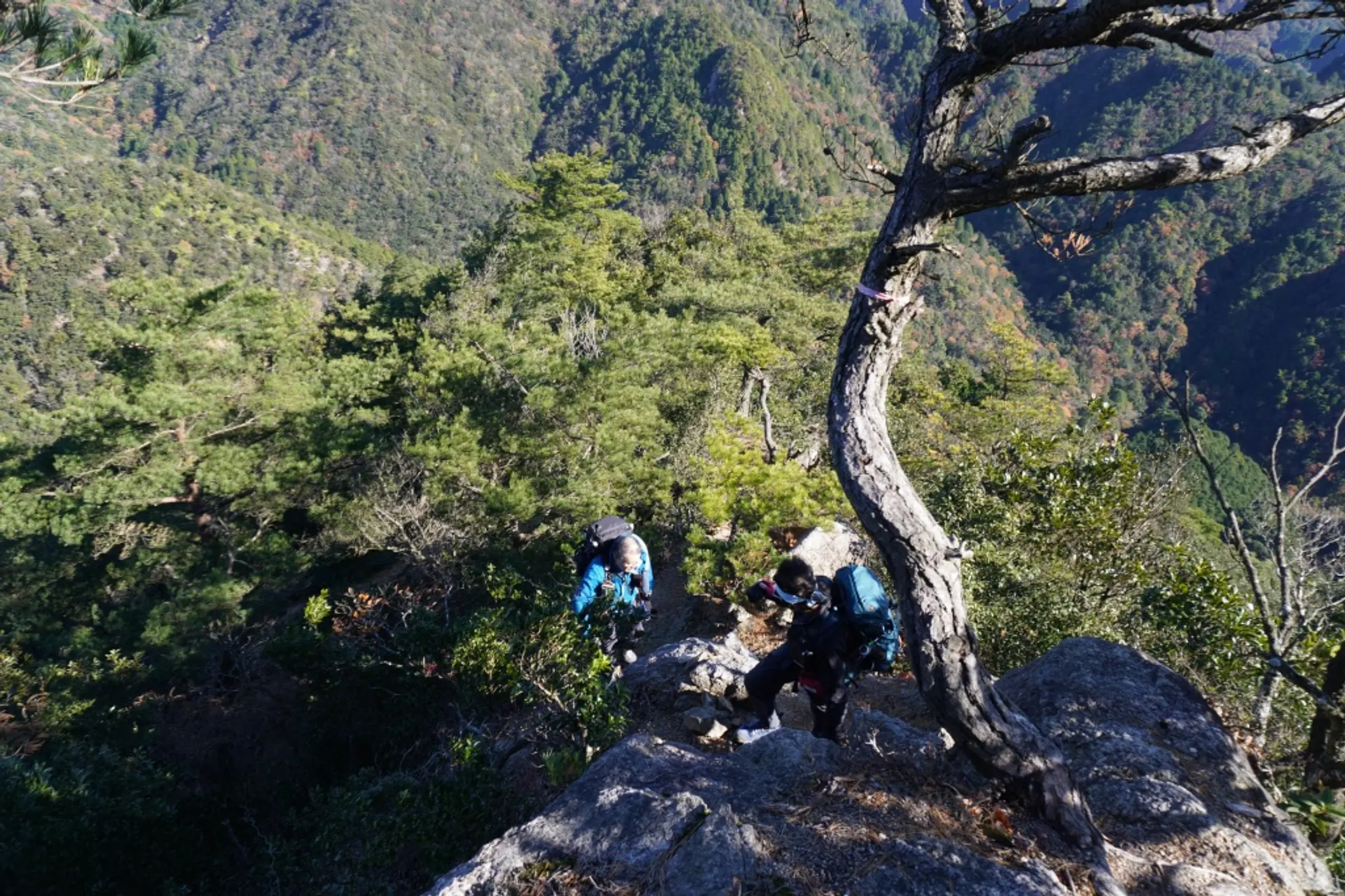登山口から約1時間歩くと見晴らしの良い岩尾根に出ます。ここから崖のような岩場が続きますので、注意して進みましょう。風通しが良い場所なので強風時はとくに注意です。岩尾根は登りよりも下りのほうが難しい箇所になります。