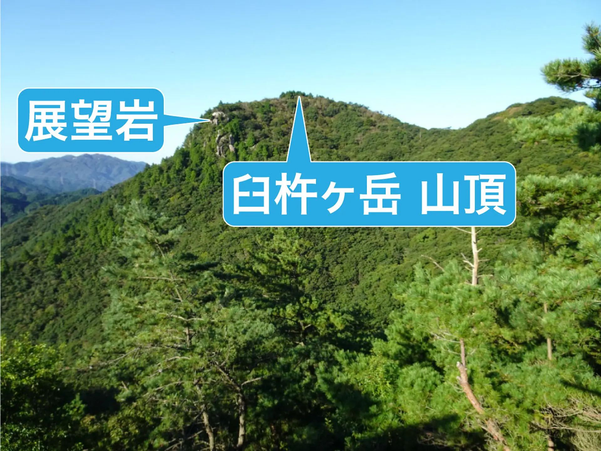 先ほどの展望ポイントから臼杵ヶ岳の山頂を眺めることができます。山頂の先にある岩峰が展望岩で、そこで食事休憩を取ります。