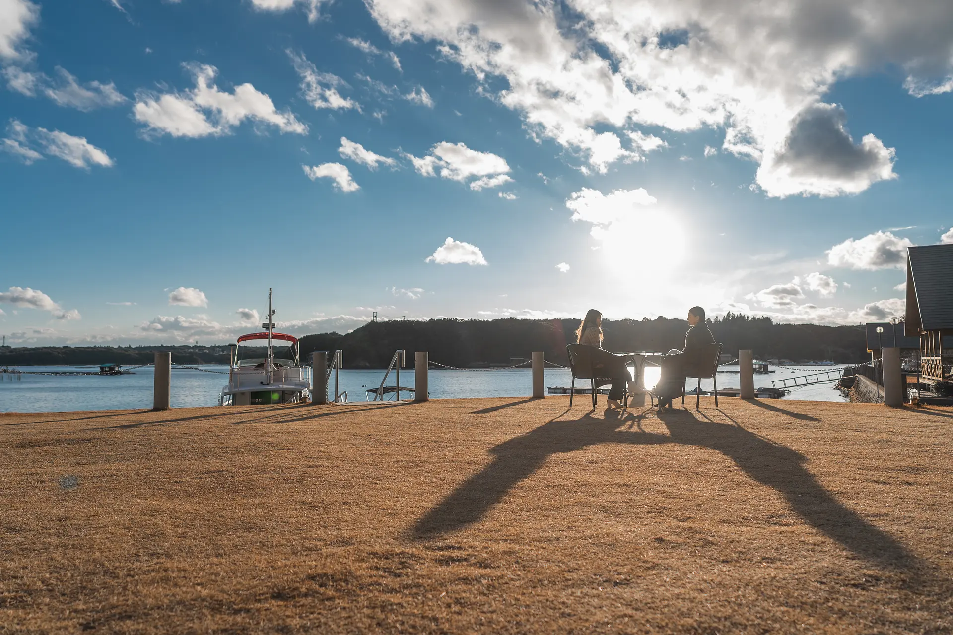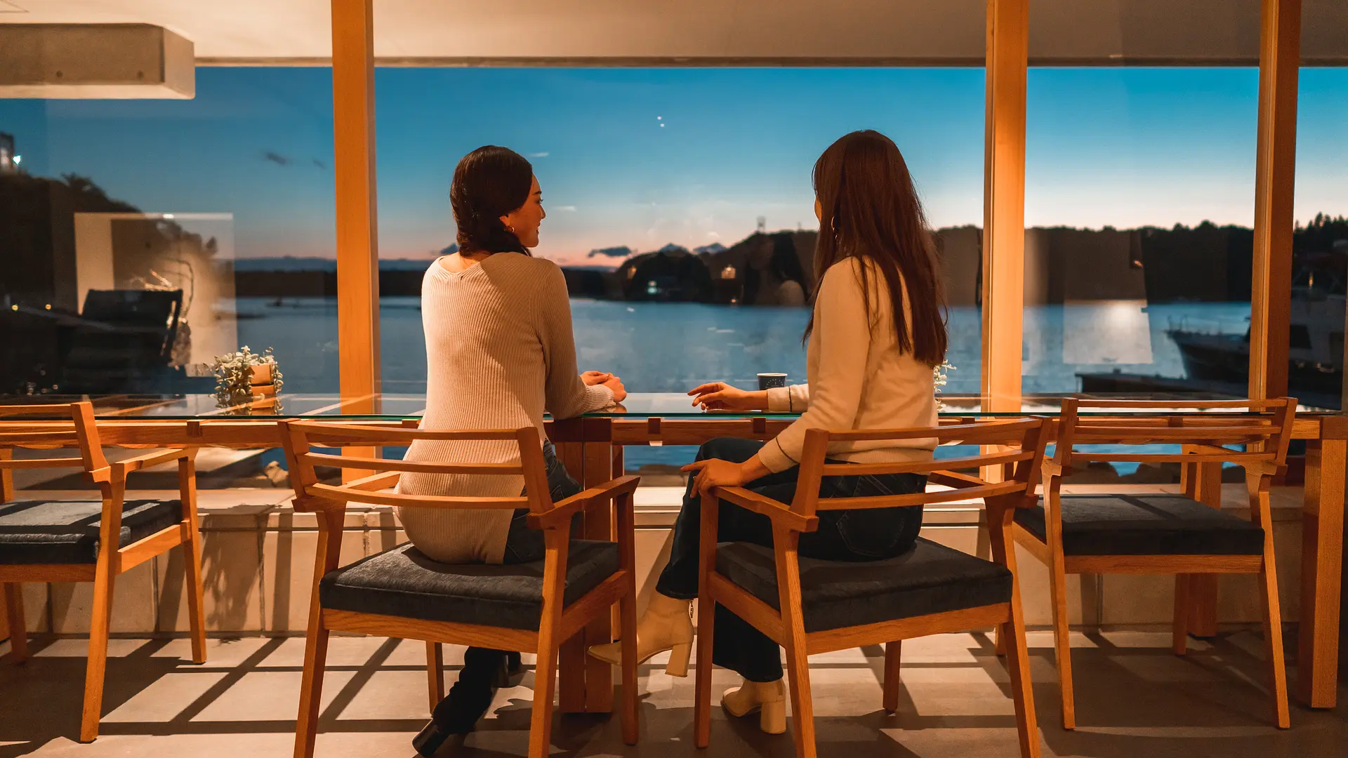 「SAZANAMI Lounge」は英虞湾に面した造りで、コーヒー、紅茶、アルコール、ジュースなどを自由にいただけるセルフラウンジ。夕暮れ時には、美しい夕焼けはもちろん、マジックアワーと呼ばれる瞬間に見ることができる夕焼けと紺碧の空が入り混じった幻想的な景色など、うっとりするような風景を楽しむことができます。