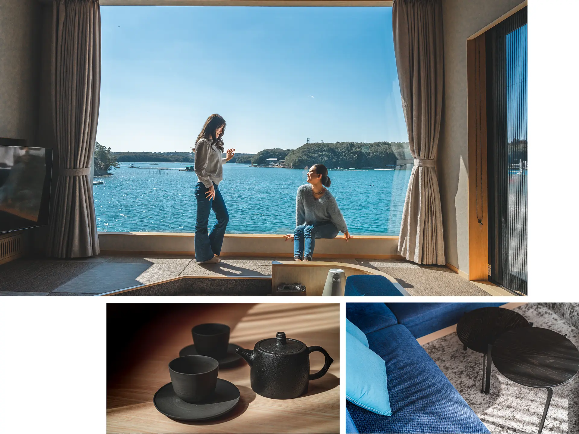 加藤遊海さん「【漣のはなれ 天月】は、英虞湾の自然豊かな景色と一体となって過ごせる上質なお部屋。心地よい静寂の中で景色を眺めていると、心が穏やかになります」