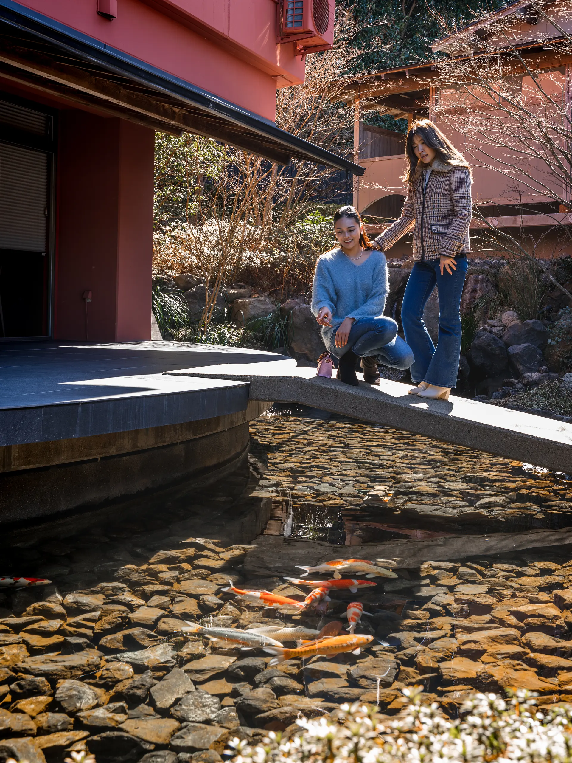 「風の桟敷」の足元には池が広がっており、スイスイと泳ぐ鯉を眺めて過ごすことができます。