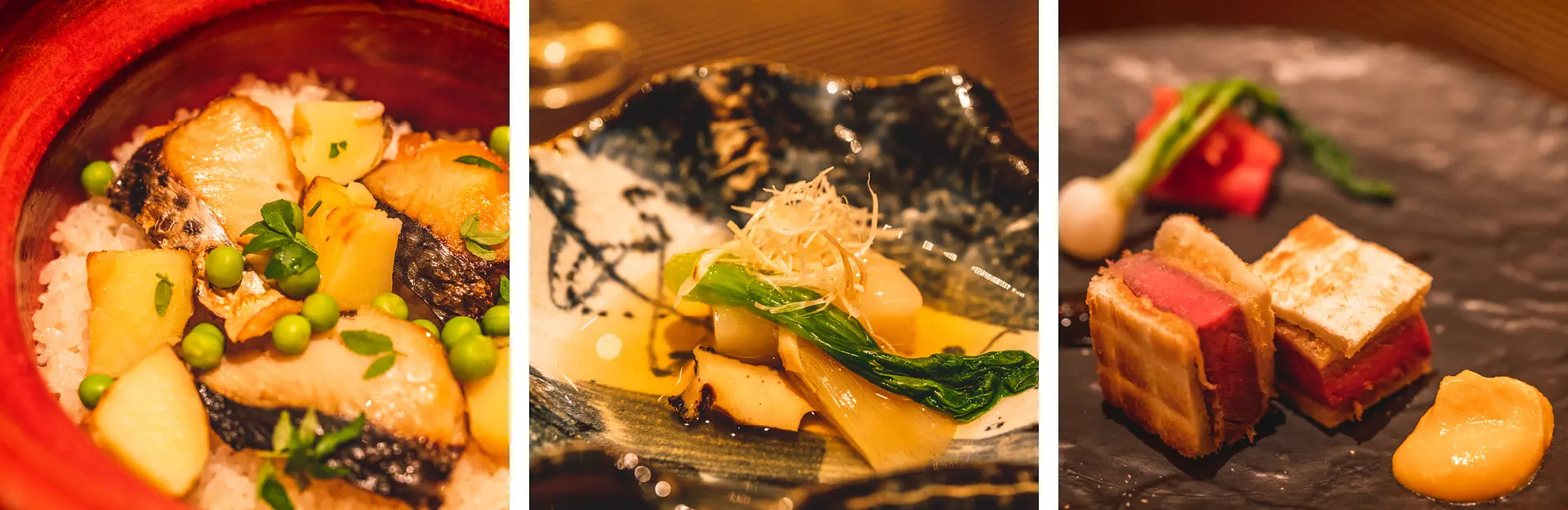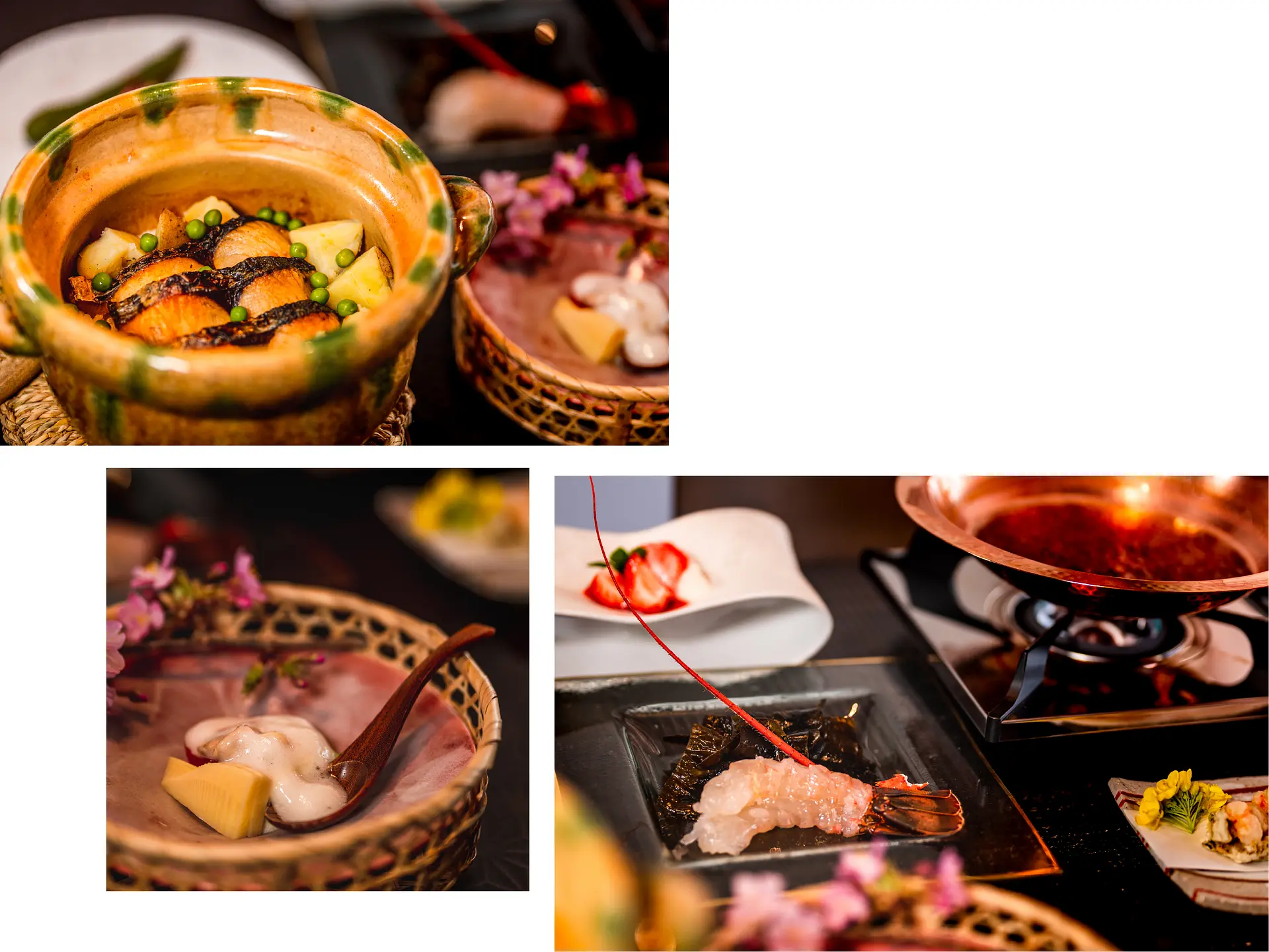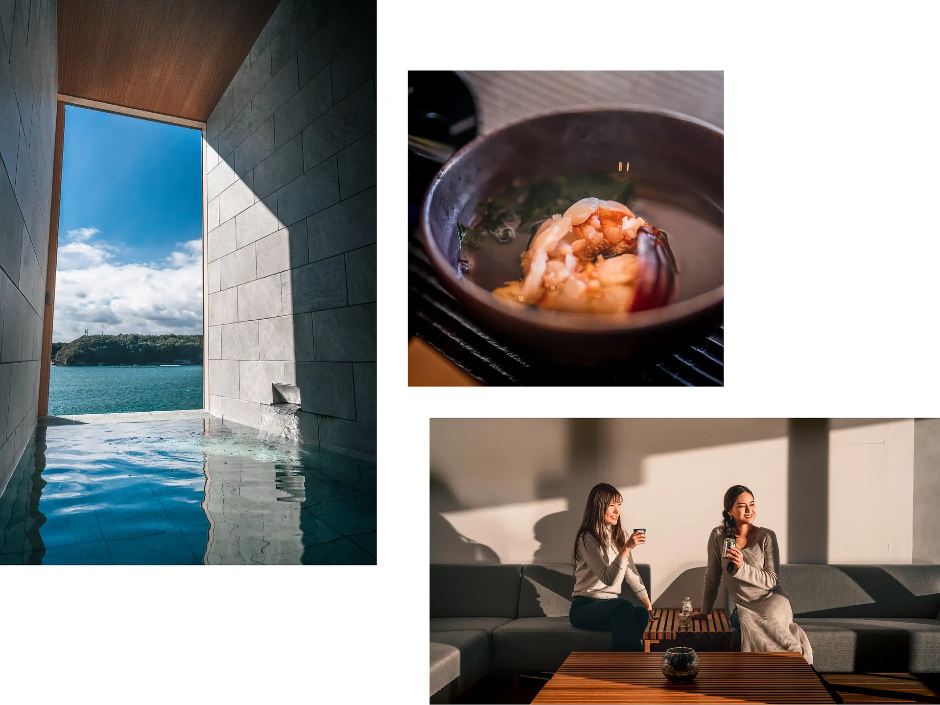 (写真は左から、別邸 漣のはなれ 星見(ほしみ)/新若芽と伊勢海老しゃぶ/SAZANAMI Lounge)