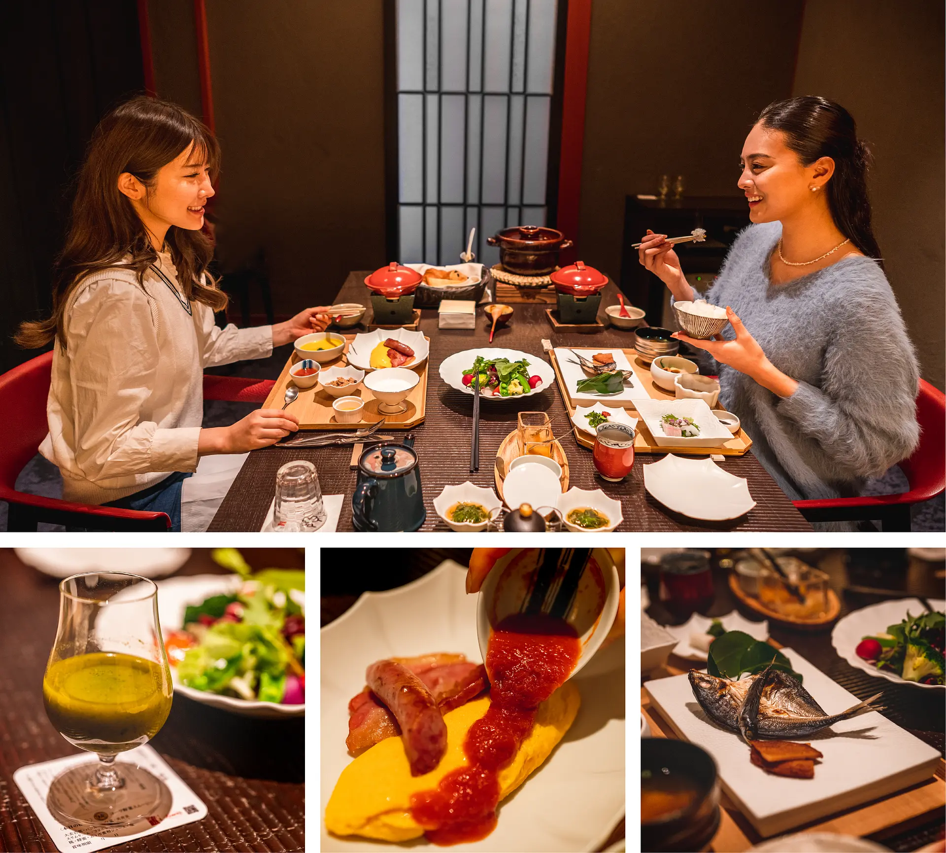 和食は志摩の干物職人が仕上げた香り高い干物や、ばさら米の釜炊きご飯などが並び、洋食は志摩野菜がたっぷり入ったサラダや、三重県産小麦を天然酵母で熟成させて焼き上げたパン、甜菜(てんさい)と地元産のフルーツで作られたジャムなど、地元の食材を朝の目覚めにぴったりな調理法でいただきます。